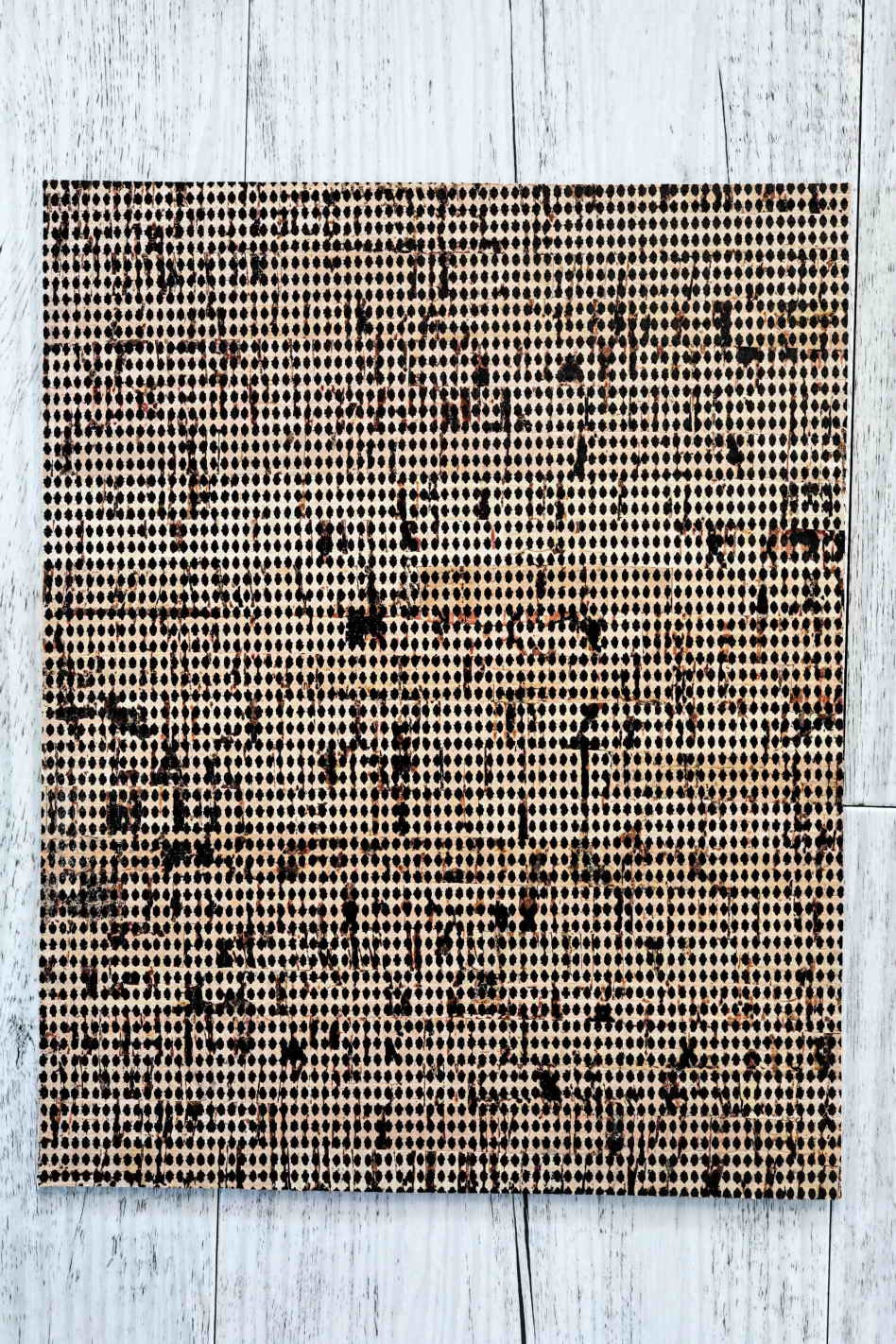 Real leather cowhide sheets backed natural cork, glossy and shiny black tiny diamonds print and taupe calf hide on the back. The diamonds have some smudges but it is a desired effect and that gives the print a more vintage look.