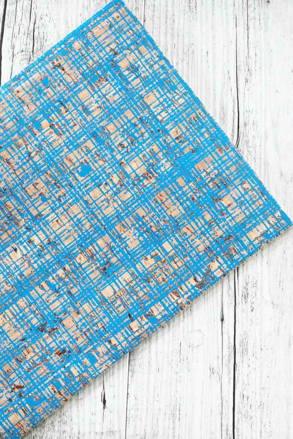 CORK on LEATHER sheets backed natural cork,made in Italy, squares in blue color print, cream calfskin on the back, for crafts