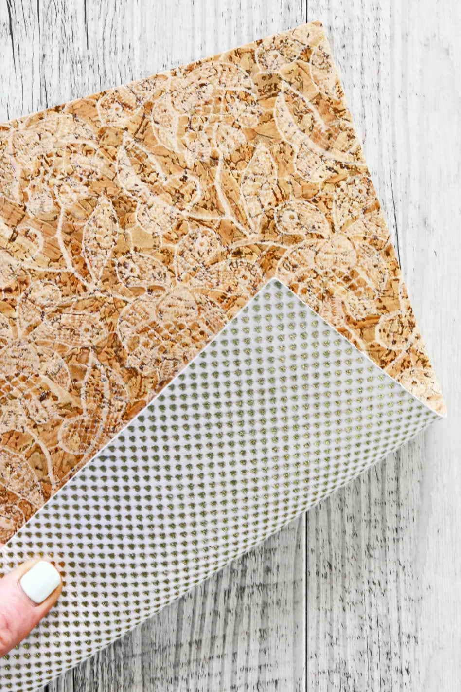 CORK on leather sheets backed natural cork, white floral textured, white leather skin tiny gold triangles on the back