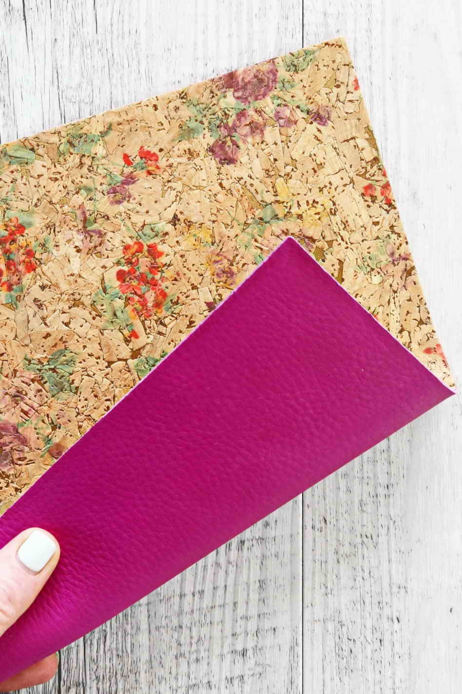 CORK on leather sheets backed natural cork, made in Italy, floral textured, violet calfskin pebble on the back