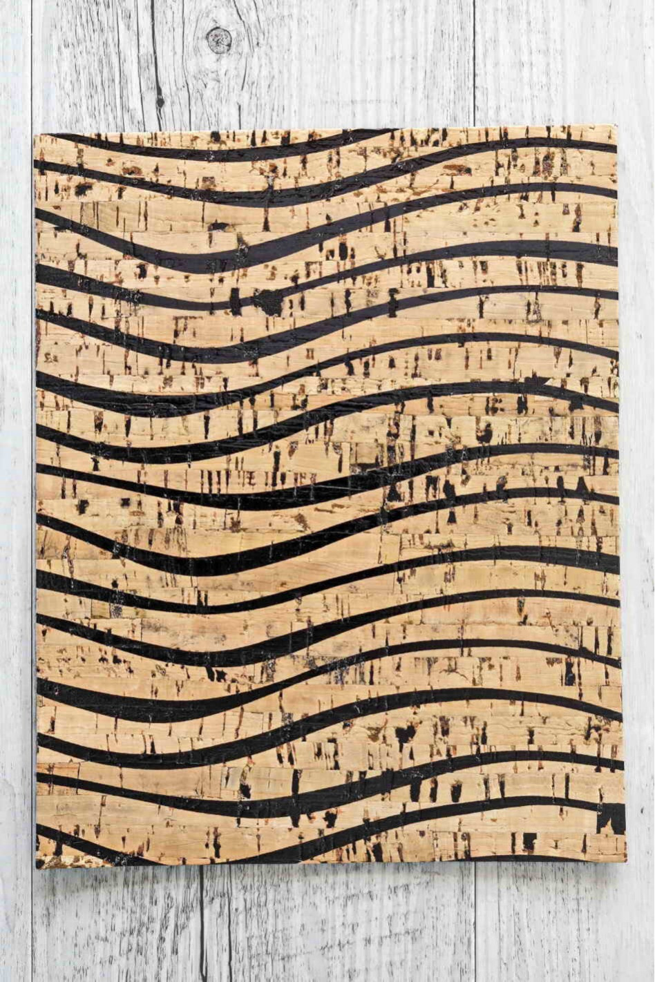 CORK on leather sheets backed natural cork, shiny black abstract textured , calfskin matte black color on the back