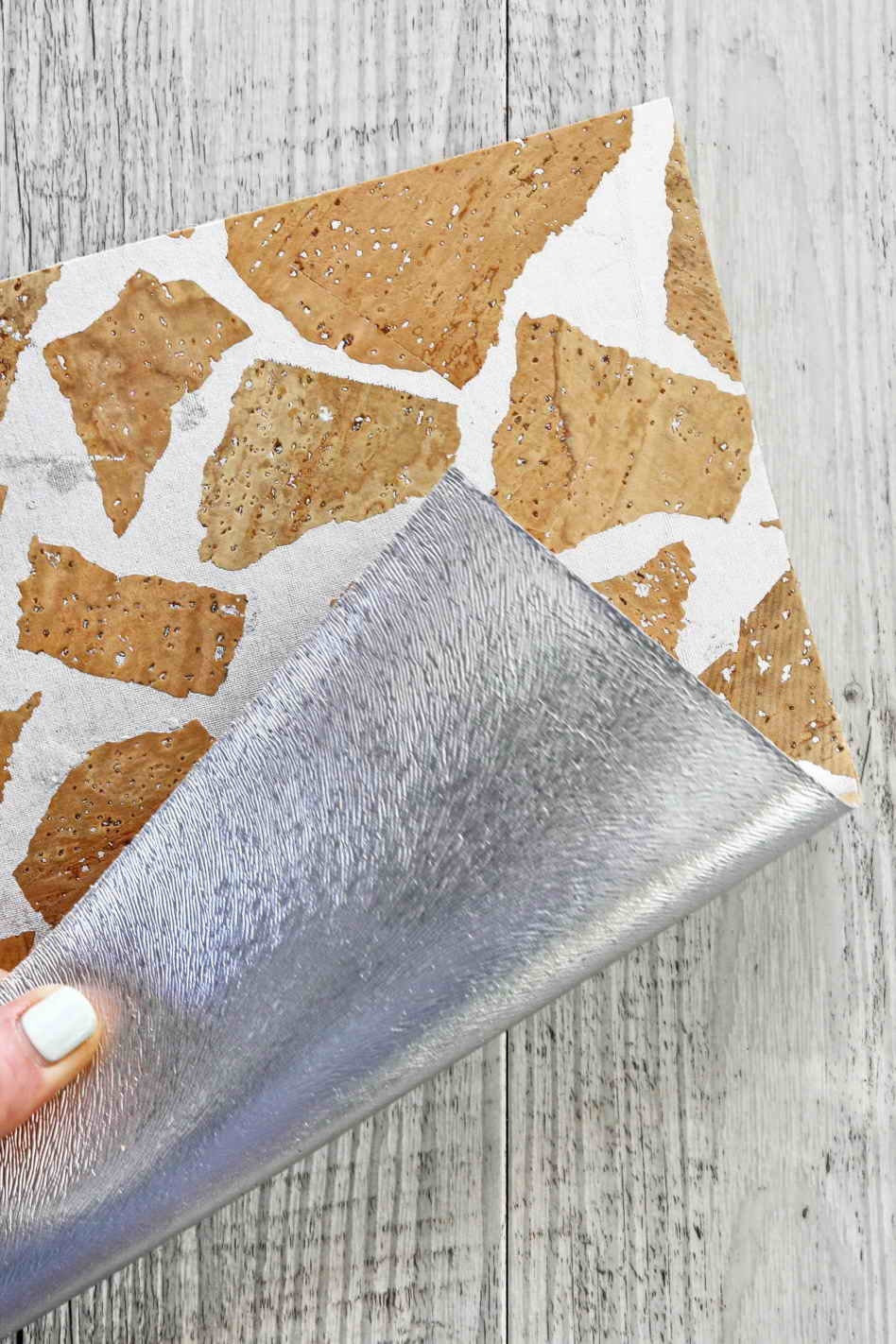 Real leather sheets natural cork backed, made in Italy, giraffe print, metallic textured silver calfskin on the back