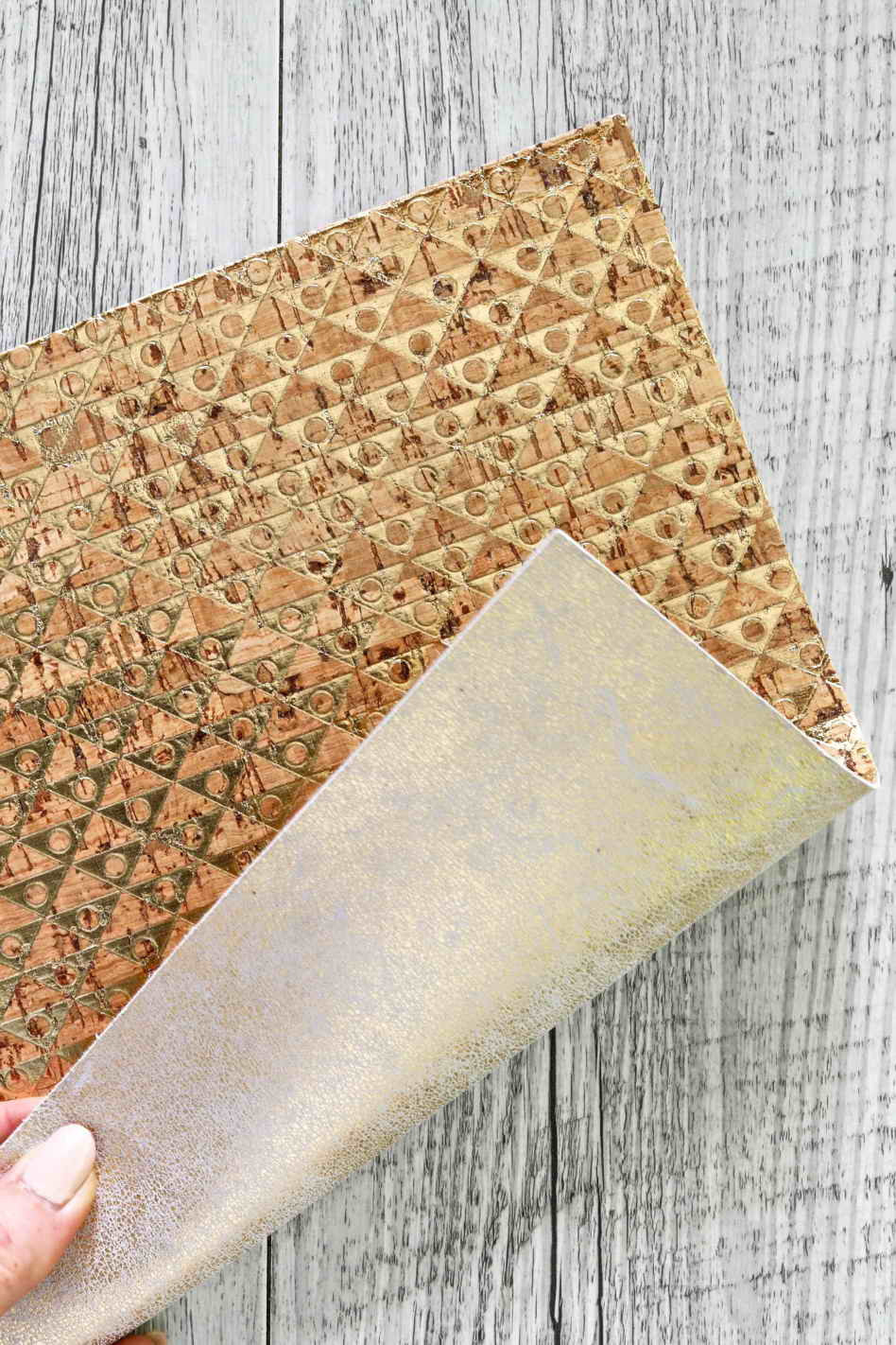 Leather backed cork sheets - gold geometric print - cork applied to gold and white cowhide leather 6x4,8 / 8x10 / 12x12 "