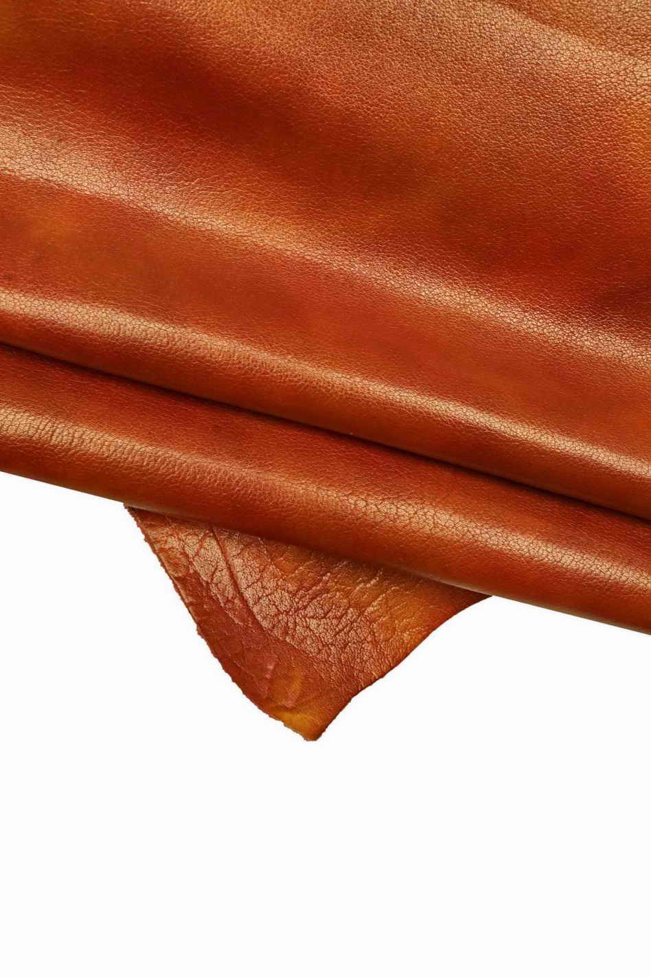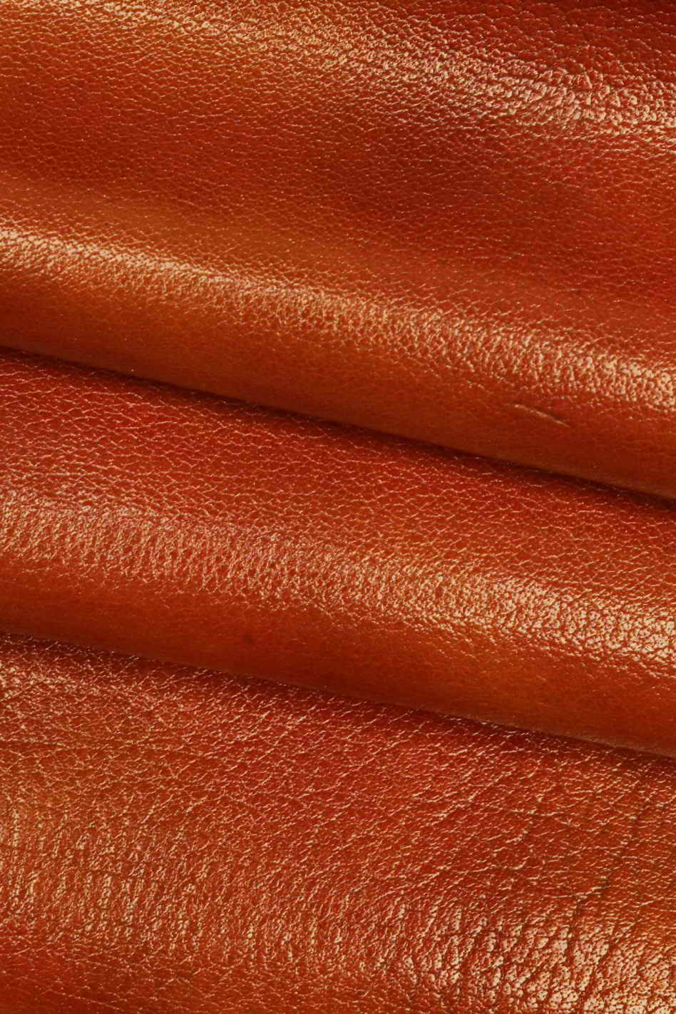 Particular goatskin with shaded grain, brown, brick red, shiny, soft and vintage.