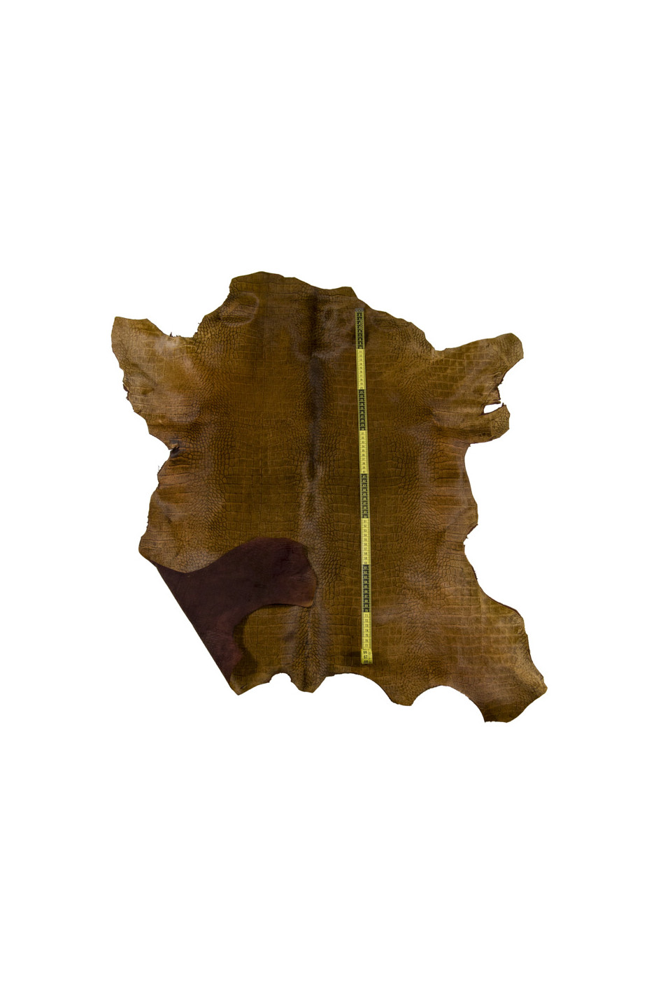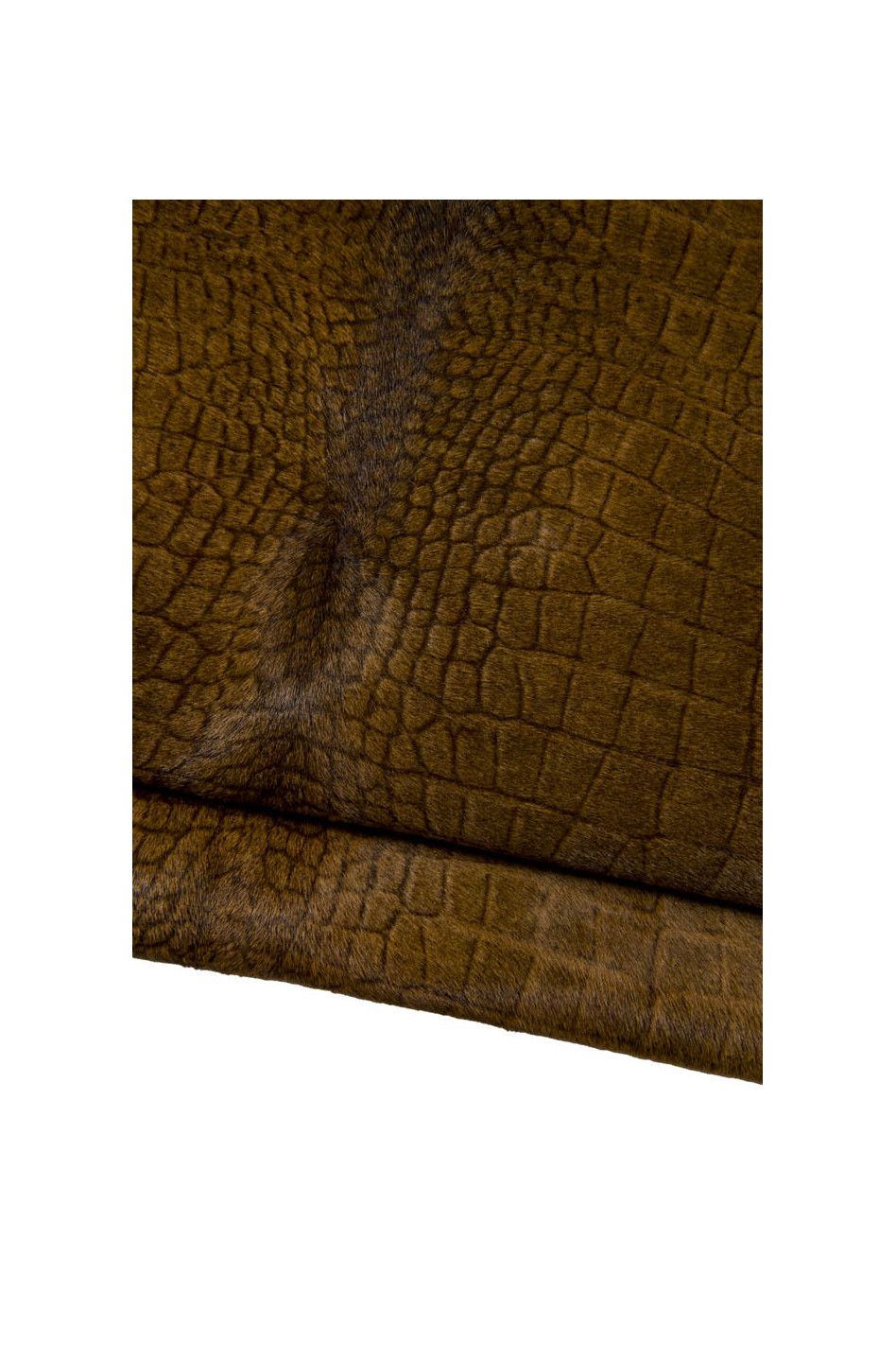 Brown CROCODILE textured hair on leather hide, animal croc printed aged hairy cowhide