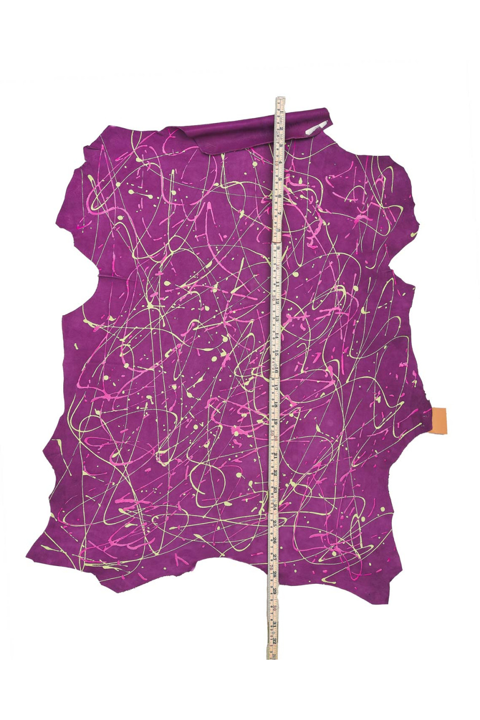 Outstanding purple - green hand made leather skin, schetch - pollock print on suede goatskin, unique leather for hobbyists.