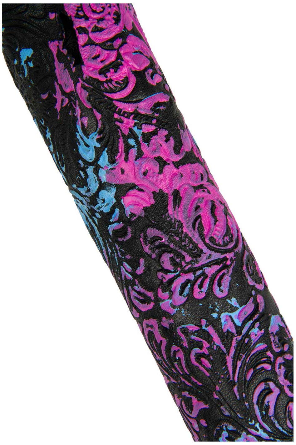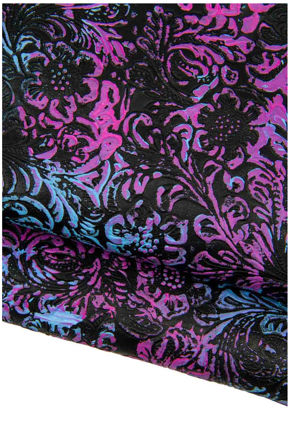 Black FLORAL hand painted leather hide, fuxia and light blue strokes soft goatskin, flower print in RELIEF