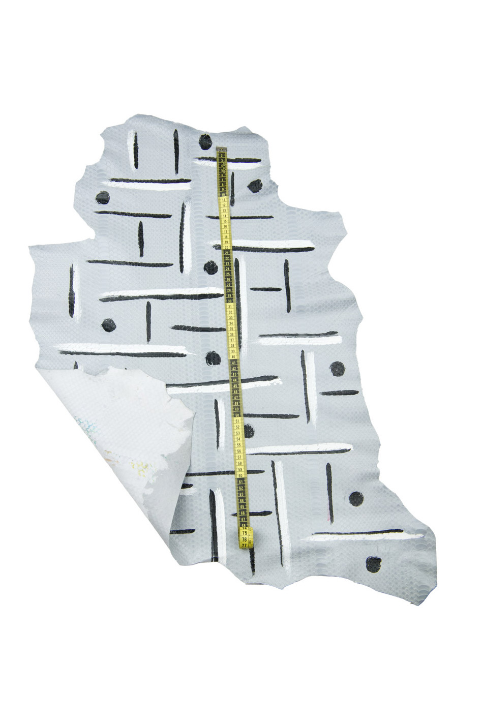 Grey REPTILE handpainted leather hide, GEOMETRICAL white and black print goatskin, unique piece for crafters