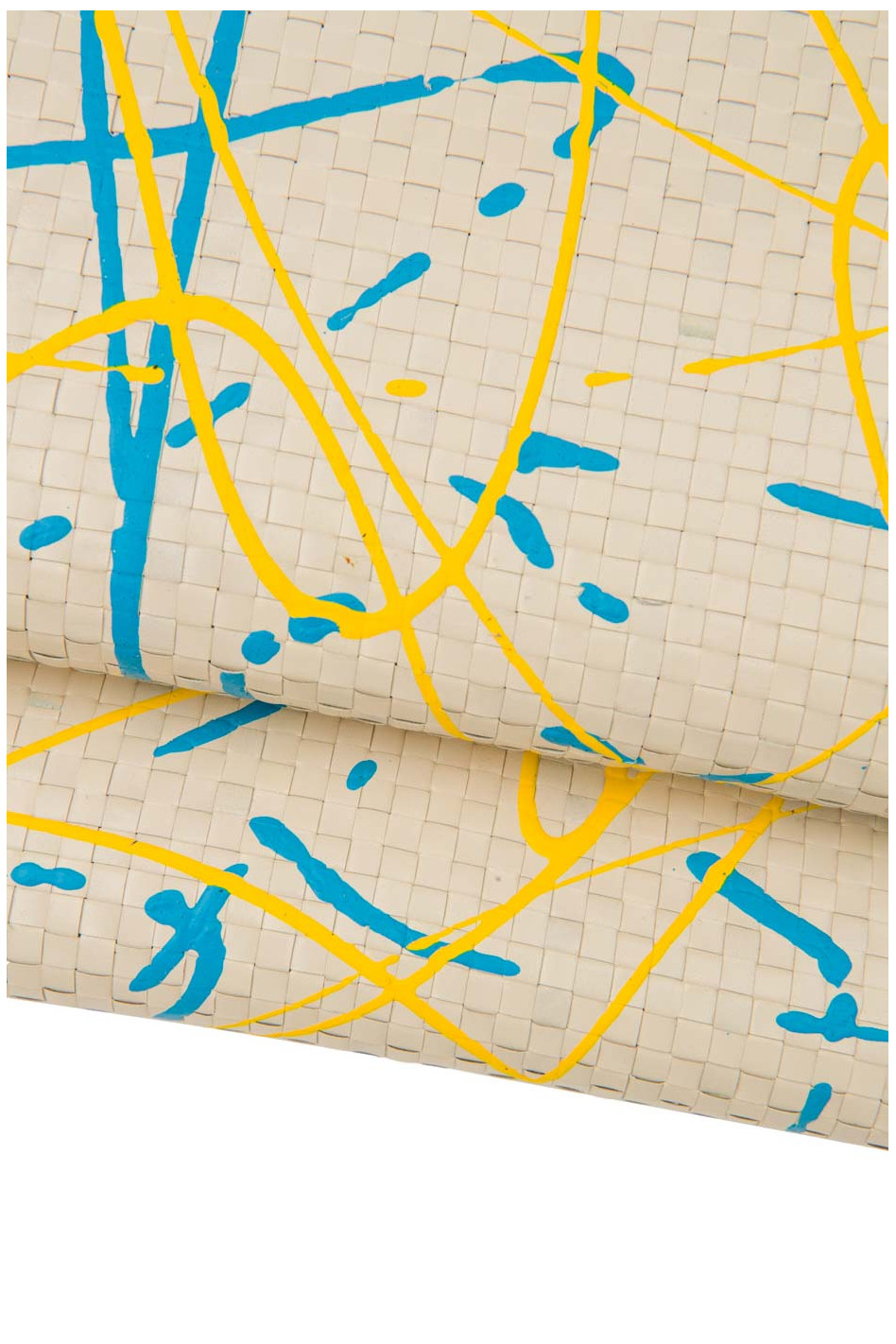 Wonderful beige braided leather hide, handpainted cowhide, yellow - blue pollock - splash print on calfskin.