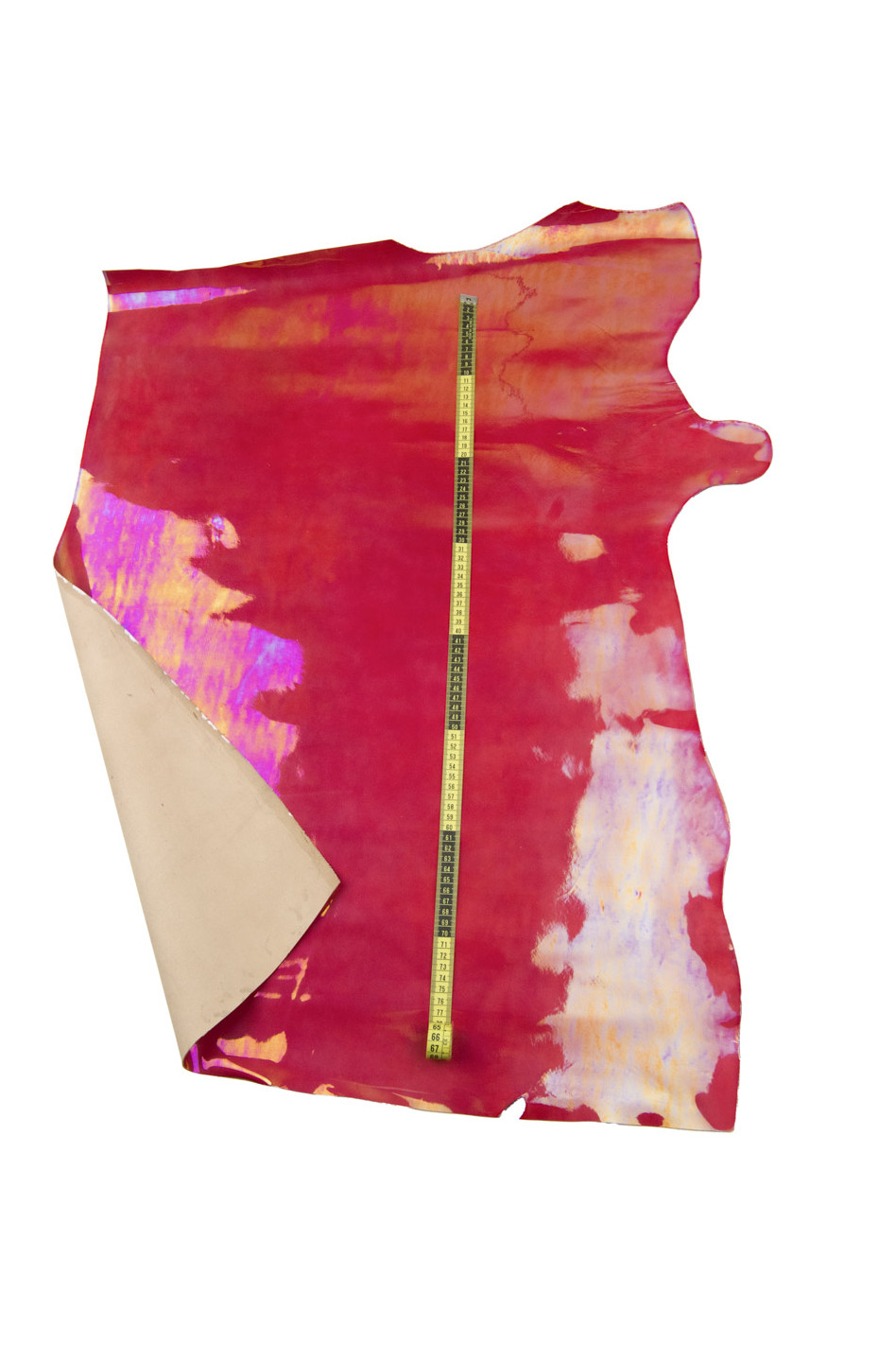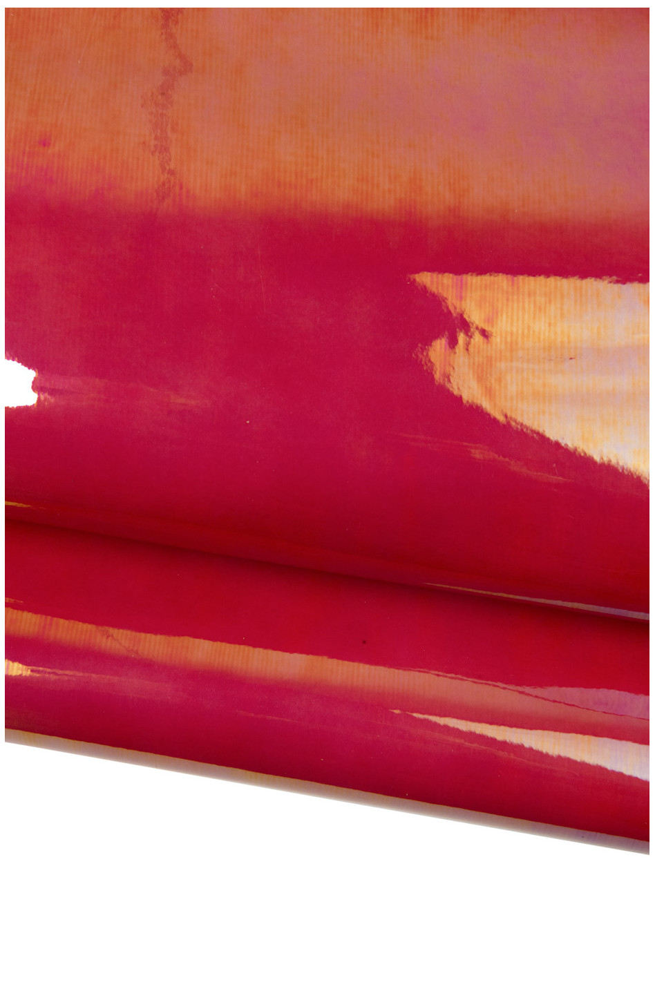Particular magenta red holographic metallic leather skin, bright patent cowhide, smooth bright calfskin, medium softness. Ideal for hobbyists.