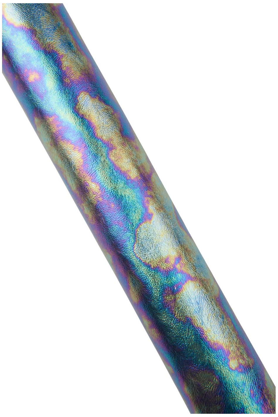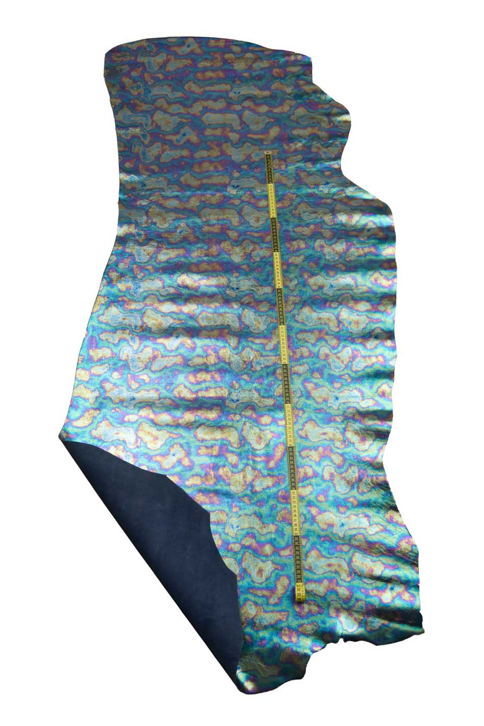 Incredible holographic leather hide, multicolor metallic print on cowhide, glossy soft material for diy projects.