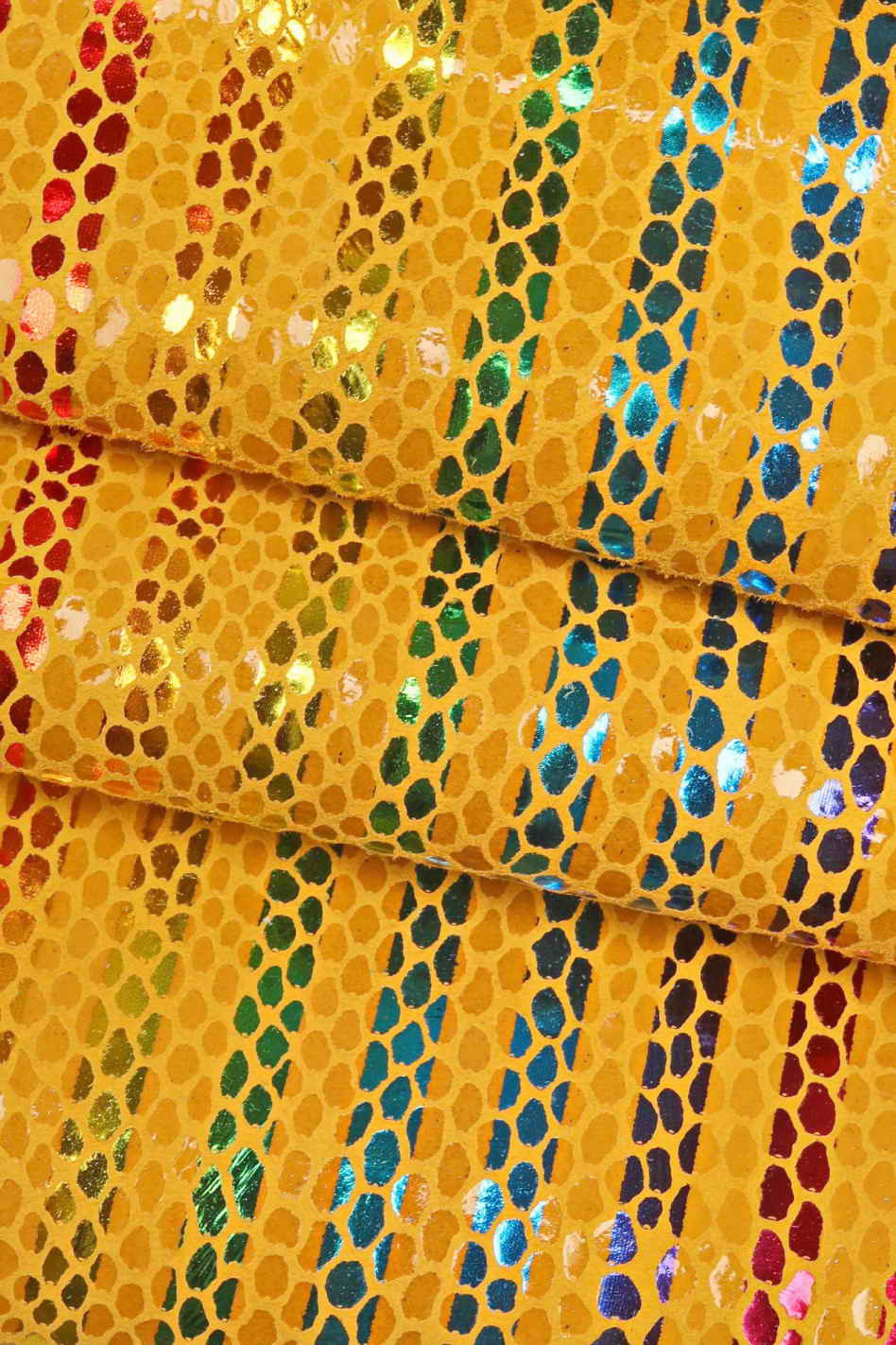 Multicolor STRIPES printed leather skin, green, yellow and orange snake texture and metallic soft suede goatskin