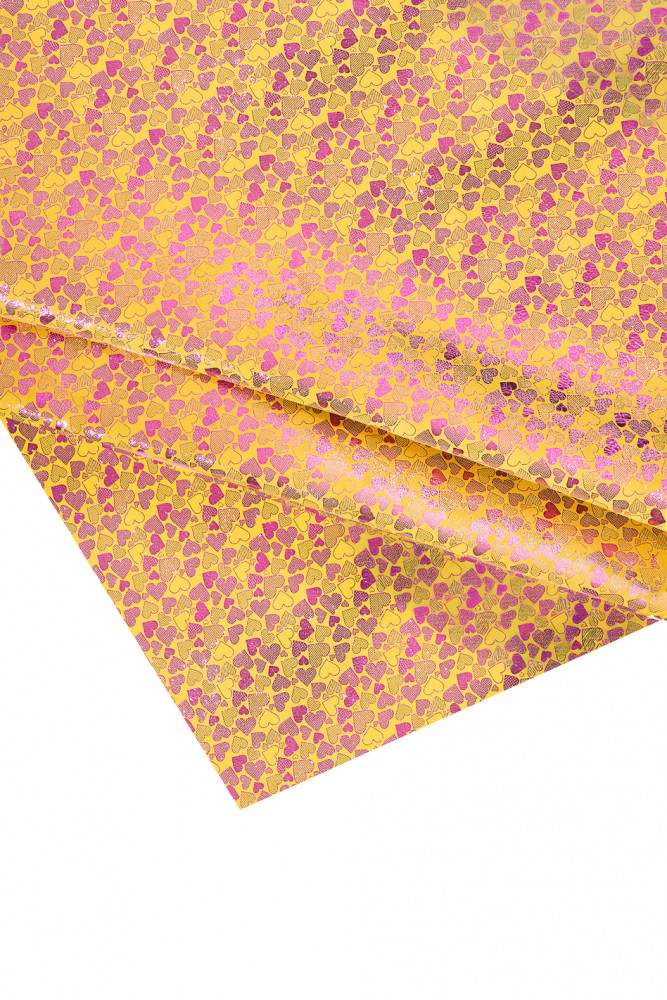 Fabulous yellow and purple goat suede leather with heart print, laminated, soft and bright.