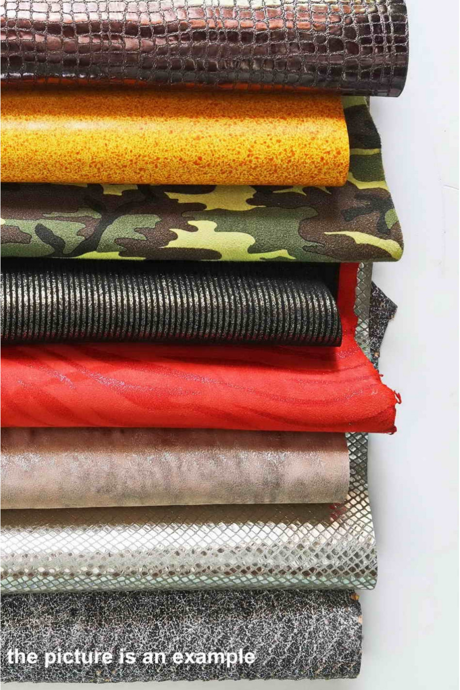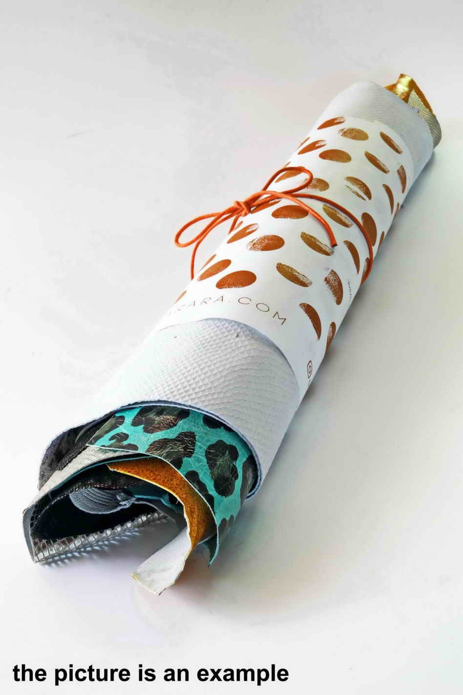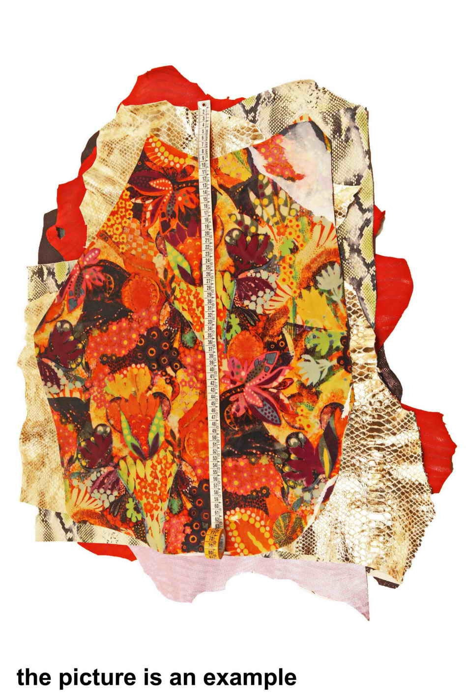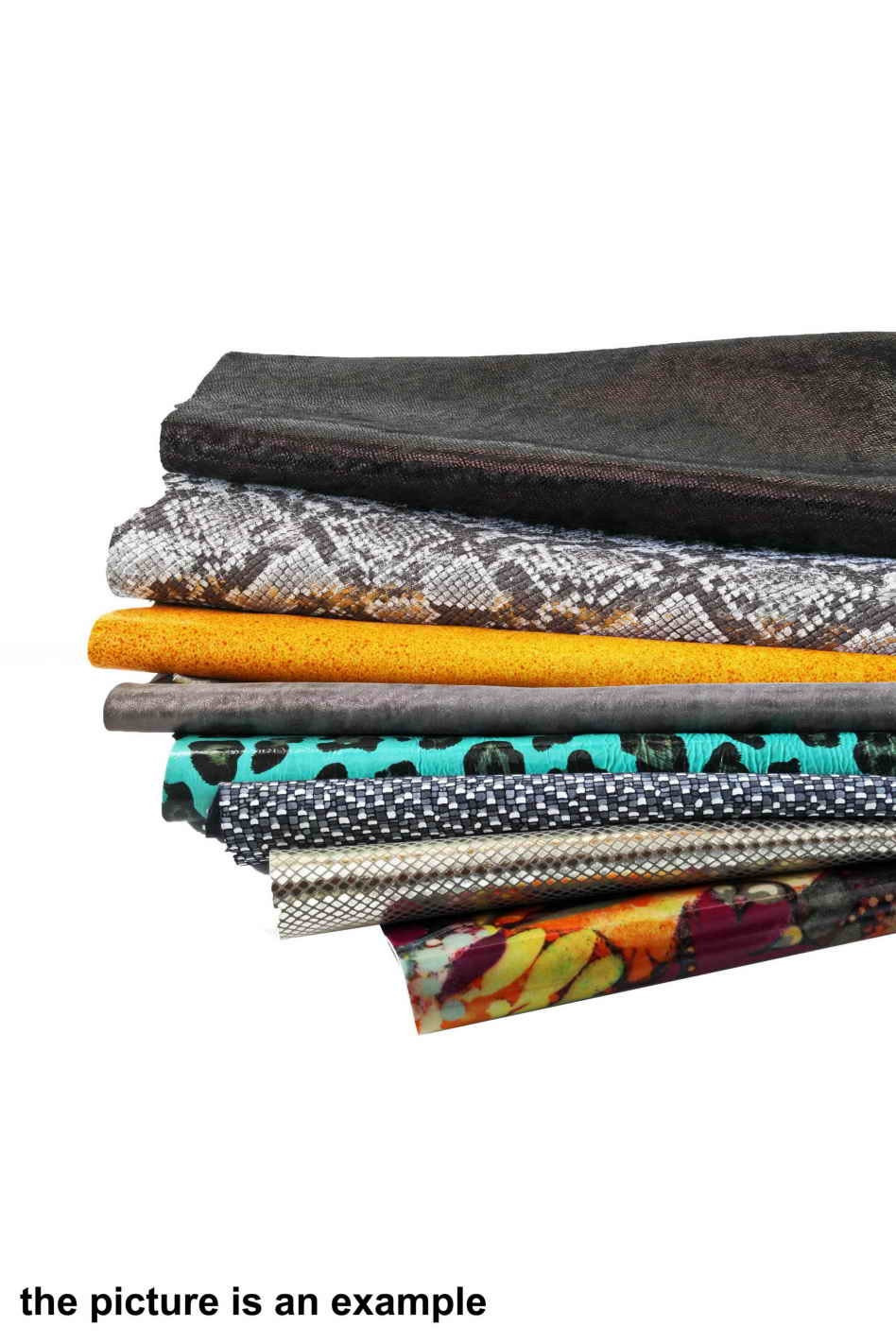 Bundles of fancy leather pieces - big size cutouts - different textures, prints, colors and softness, sporty looking. Packs of 5 pieces or/and 8 pieces available. Cutouts of genuine Italian leather. The smallest approximate size is 16 x 16 inches.