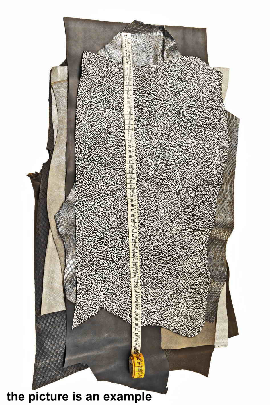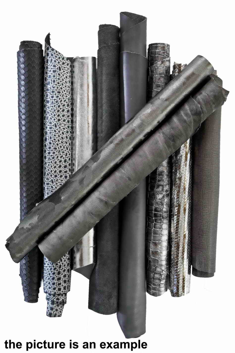 Bundles of 10 or 15 fancy leather pieces - medium size cutouts - different textures, prints, colors and softness, sporty looking. Cutouts of genuine Italian leather. The smallest approximate size is 10 x 8 inches and the largest is 16 x 16 inches.