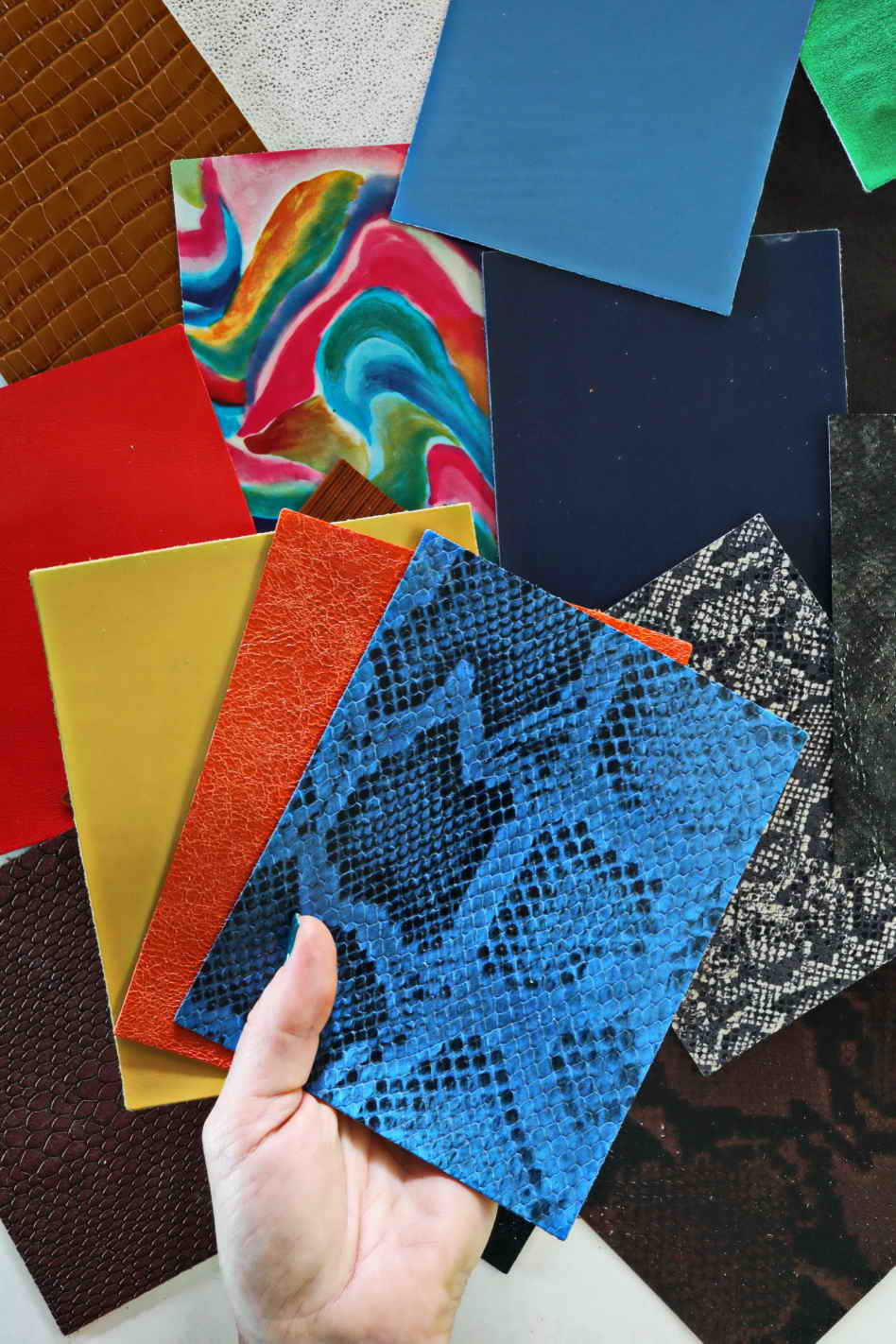 Leather sheets, mix of textured, metallic, distressed and solid colors leather pieces for crafts. Cutouts of genuine Italian leather.