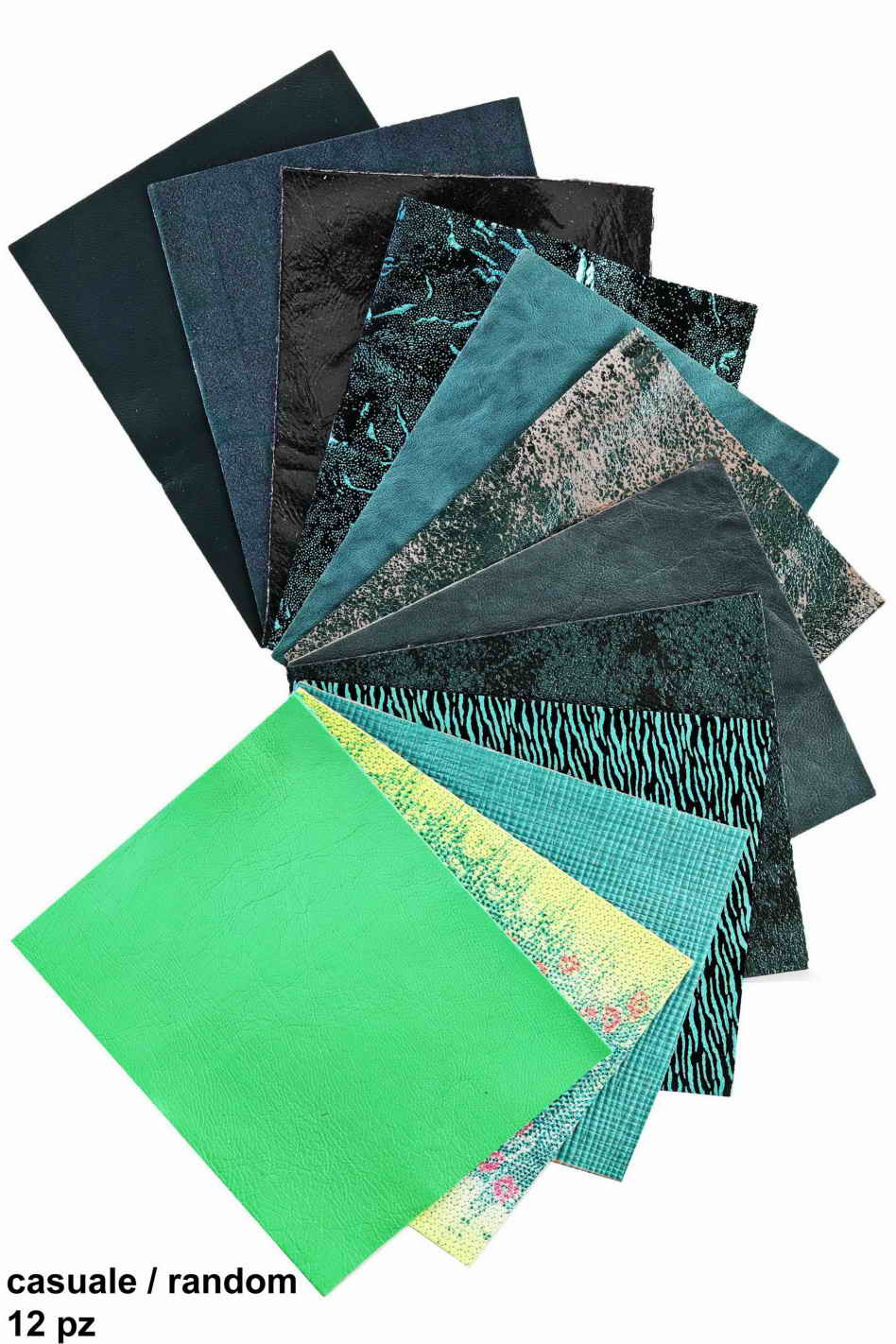 Stock of 12 MIXED PIECES green, pre cut leather hide, printed, metallic random selection, 5 x 6 inches