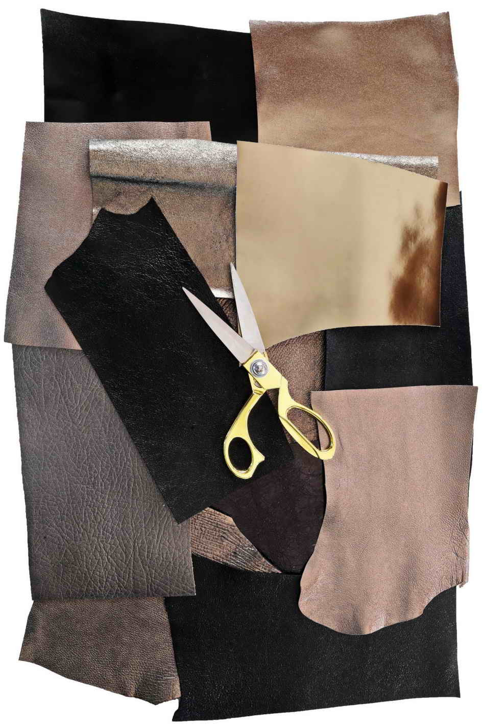 10 fancy leather pieces, steel, grey and black tones metallic, smooth with different grains and thicknesses. Cutouts of genuine Italian leather.