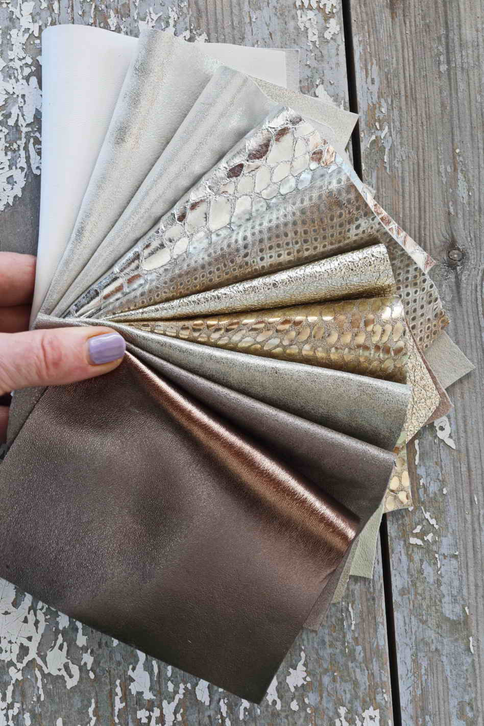 10 fancy leather pieces, platinum, white and gunmetal tones metallic and not metallic, solid colors, smooth with different grains and thicknesses. Cutouts of genuine Italian leather.