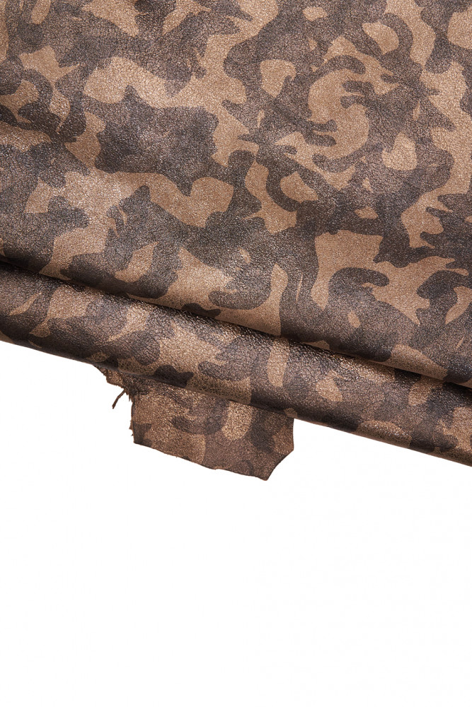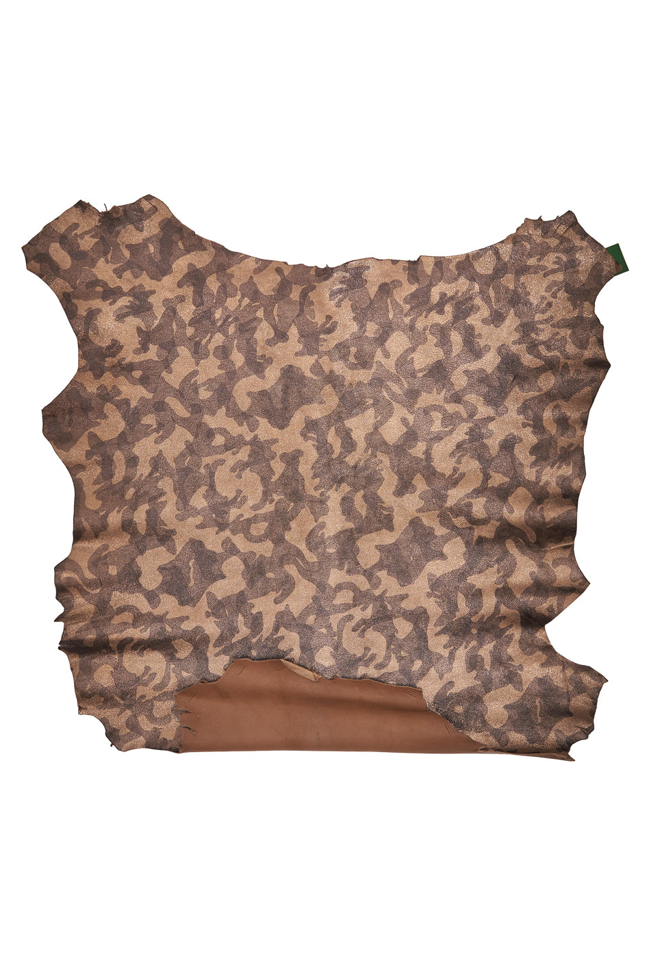 CAMO textured metallic leather hide, brown black printed goatskin, mimetic pattern on soft suede hide