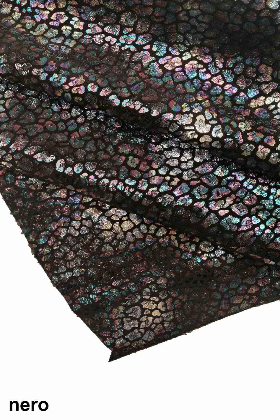 Incredible holographic leopard leather hide, animal pattern - cheetah print - on black cowhide, iridescent metallic calfskin. perfect for hobbyists and crafters.