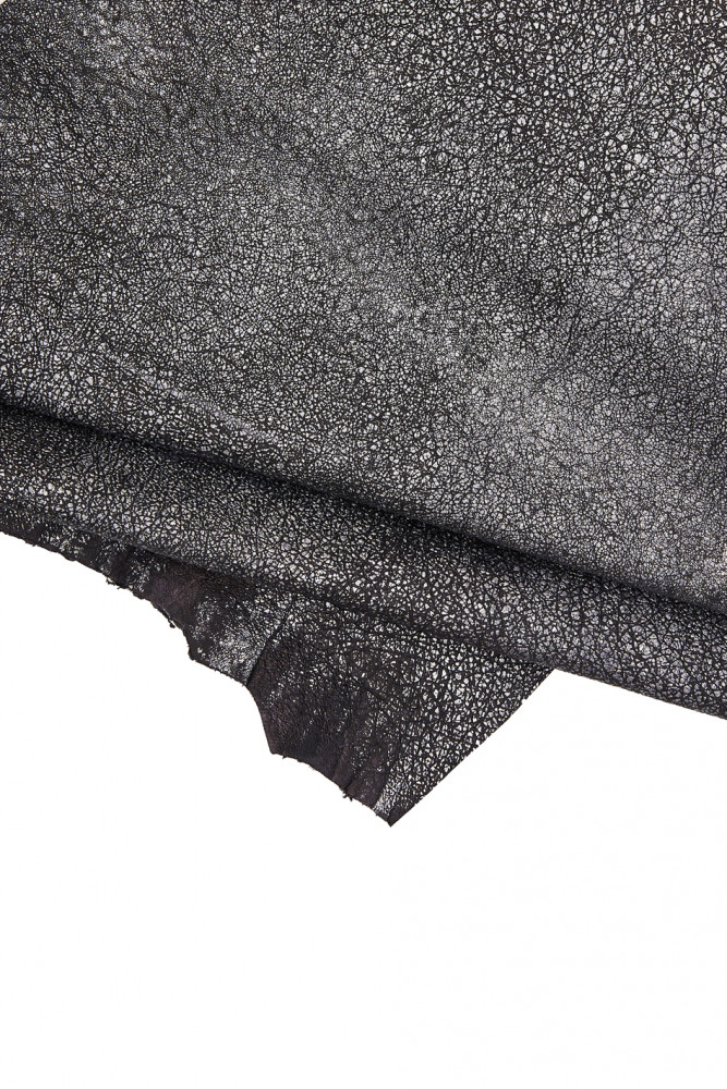 BLACK steelmetal leather skin, wrinkled goatskin, metallic aged distressed hide 0.9 - 1.0 mm