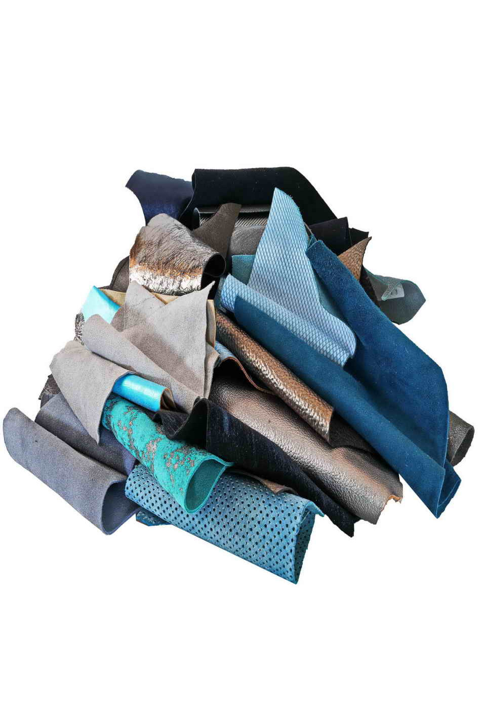Leather scraps bag, BLUE and GREY tones, fancy textures, foils and softness various, 0,7 lbs to 2 lbs