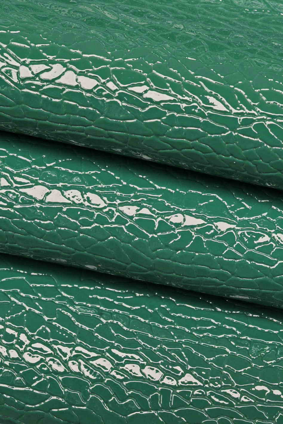Original petrol green and dark gray patent calfskin with crackle-like print, shiny, medium softness.