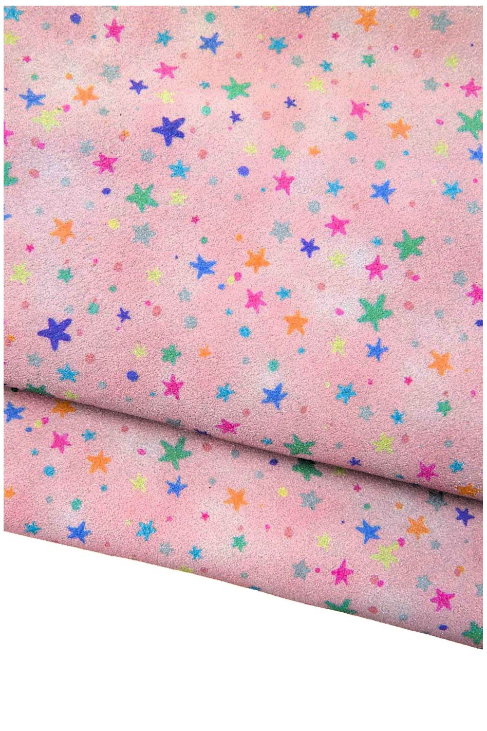 Particular multicolor star printed leather hide, pink SUEDE calfskin - colorful pattern, glitter calfskin for DIY projects.