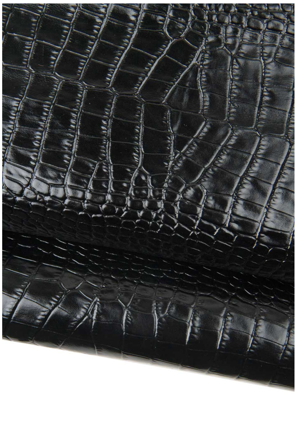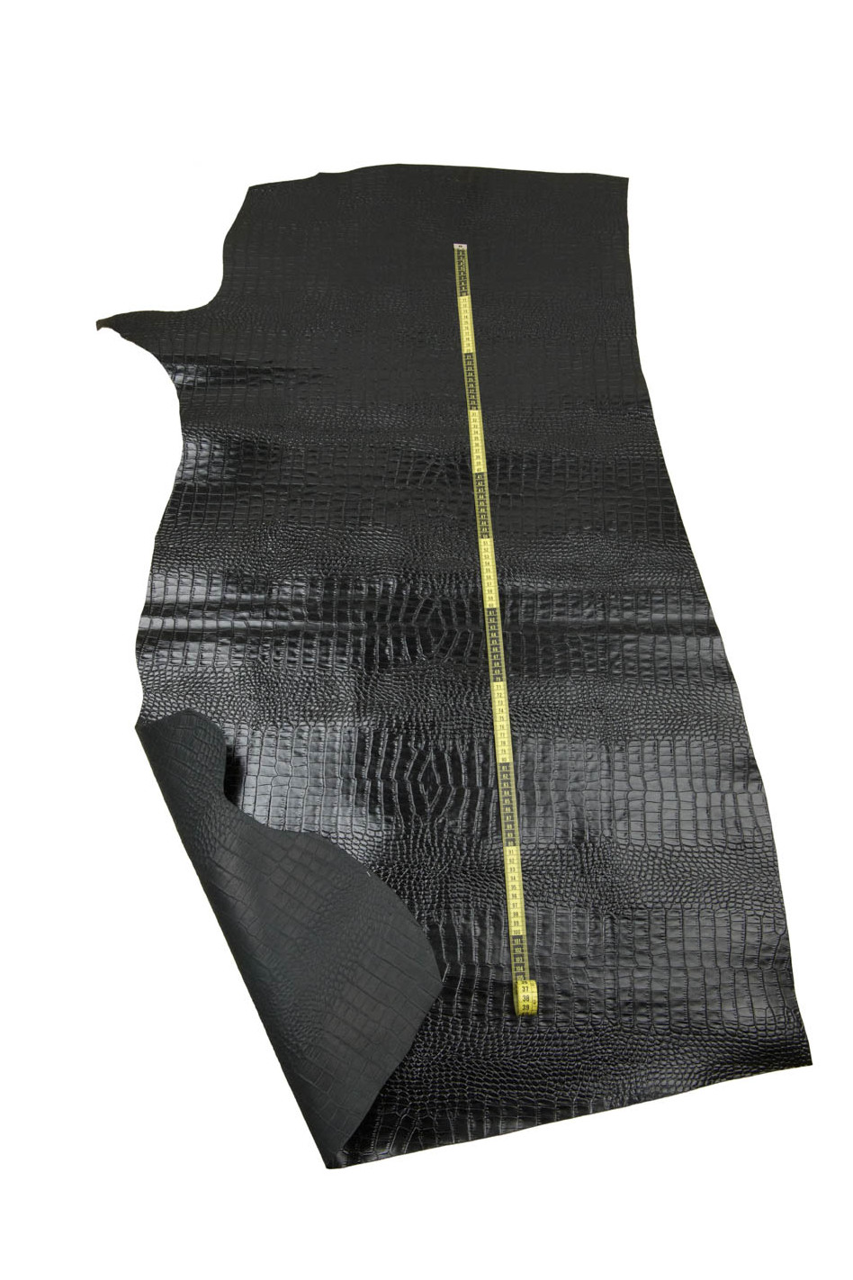 Black CROCODILE embossed leather hide, ALLIGATOR print on cowhide, glossy calfskin for crafting, 0.9 - 1.1 mm