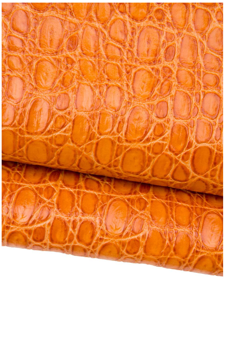 Wonderful orange crocodile embossed leather hide, top quality glossy calfskin, cowhide for crafting. Slightly stiff leather.