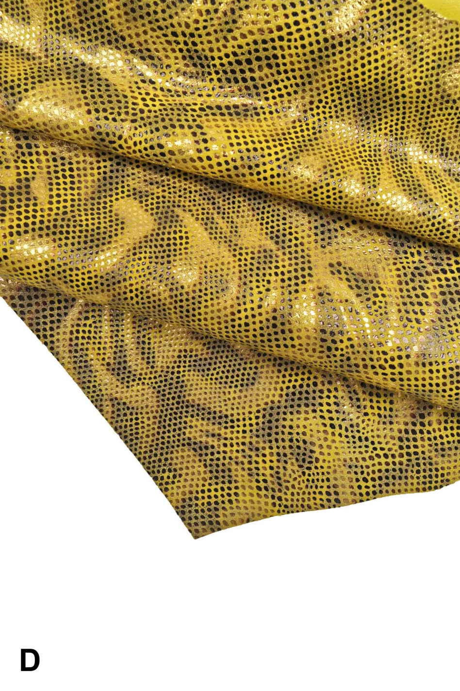 Italian leather, laminated suede with snake print and zebra-like print, bright, soft, sporty-refined look, available in 5 base+print combinations: brown base+black-gold print (A), red base+silver-black print (B), tan base+gold-black print (C), yellow base+gold-black print (D), white base+silver-black print (E).