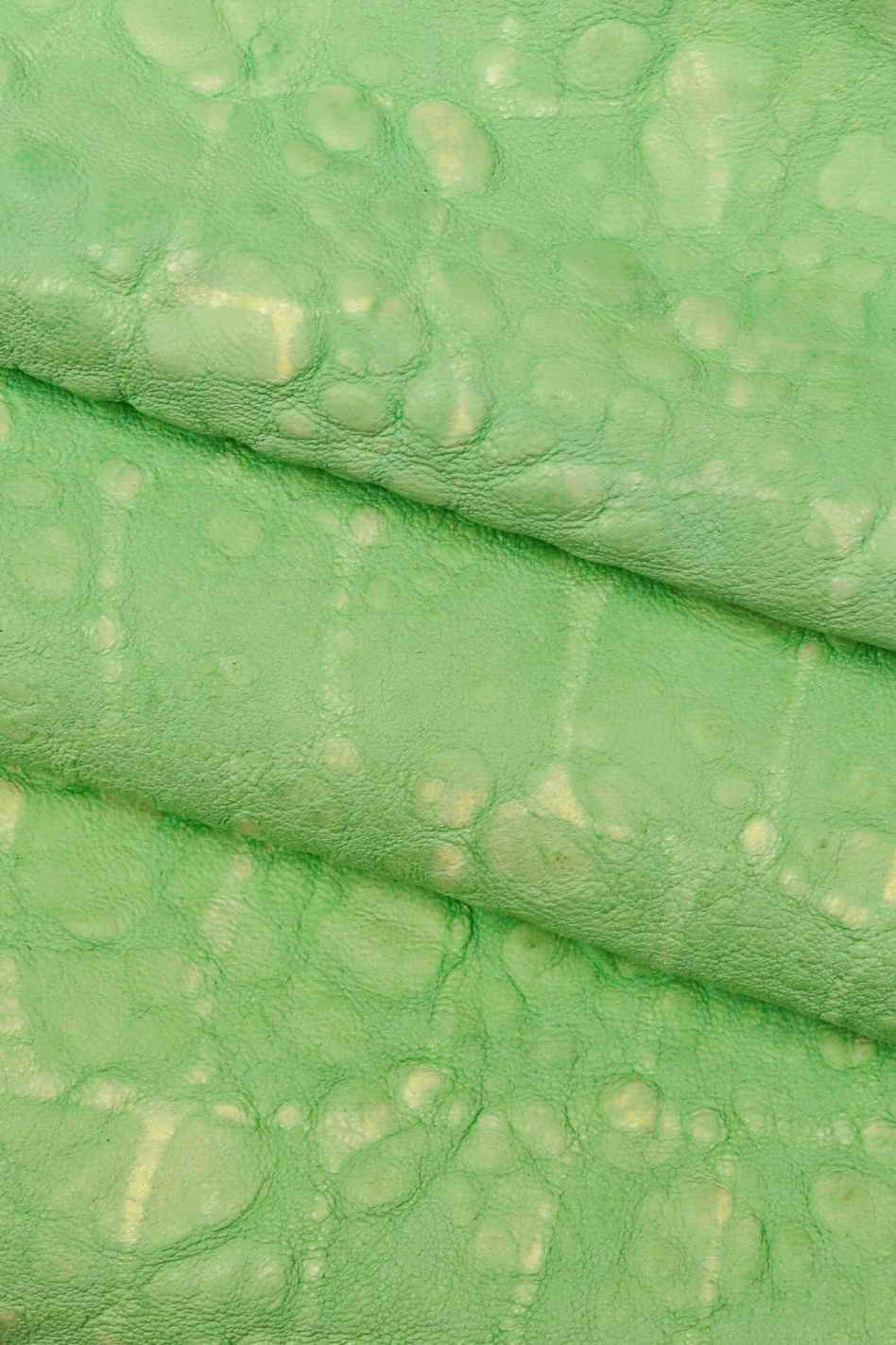 Fabulous light green goatskin with crocodile print and irregular grain, sporty and soft.