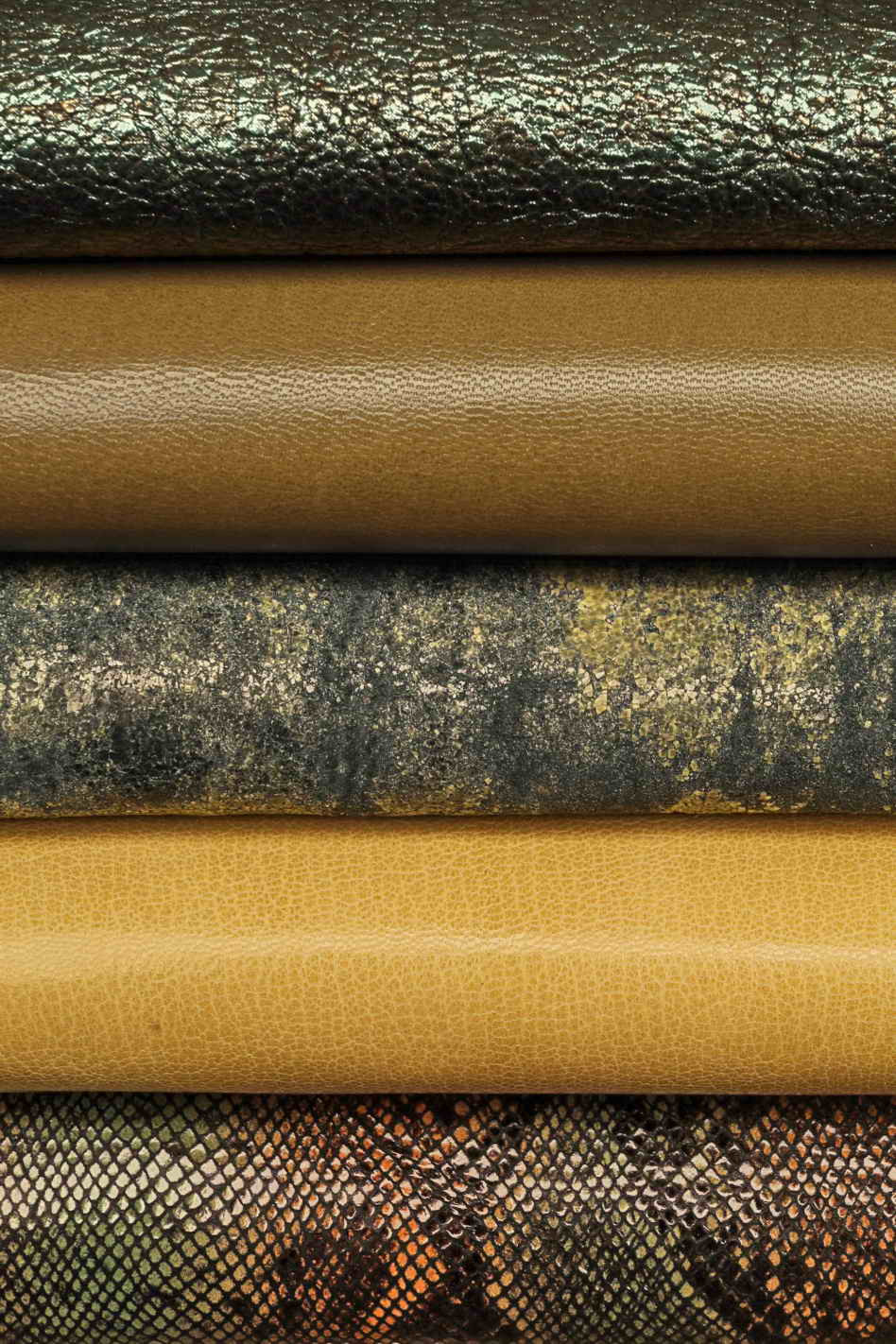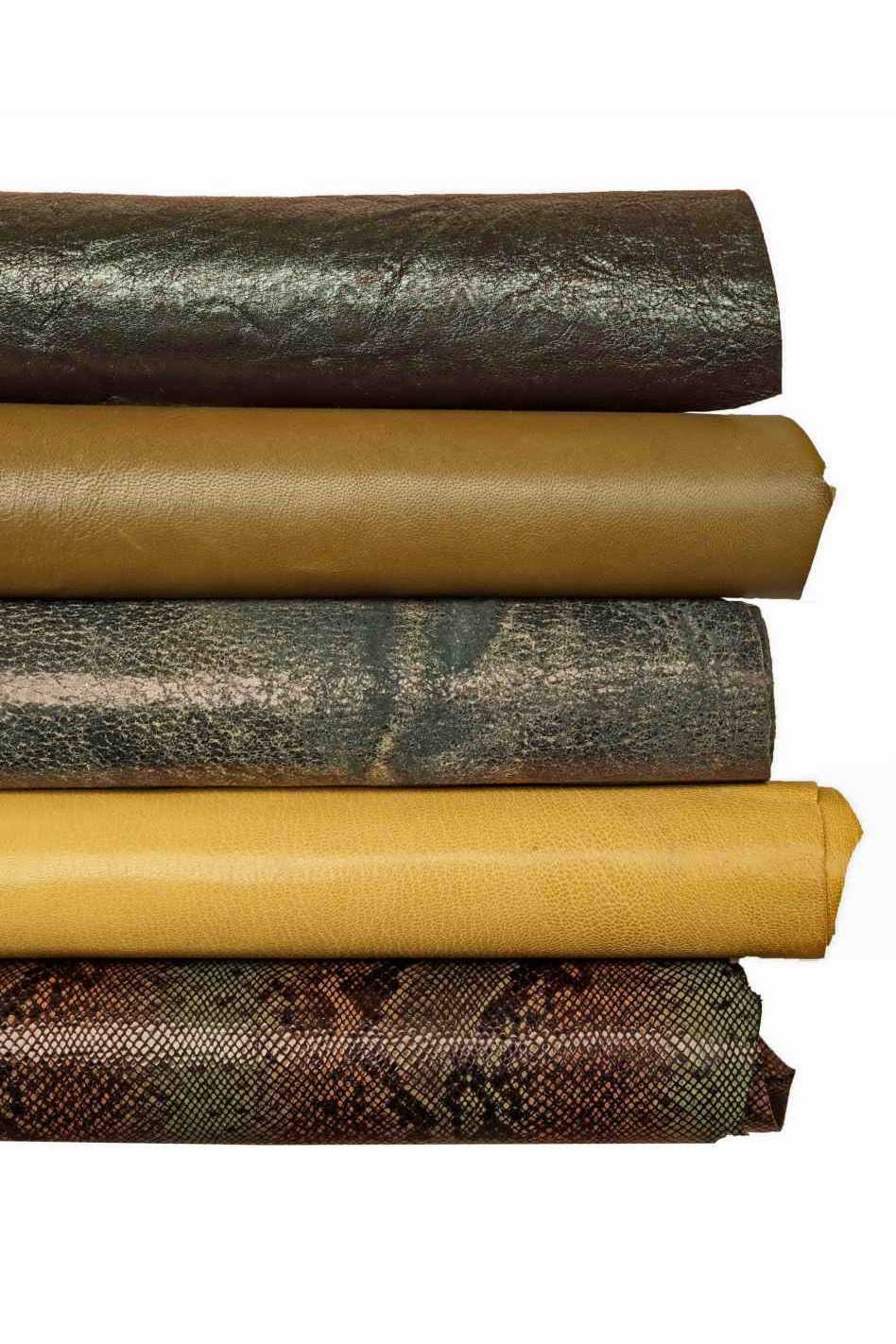 Pack of 5 GREEN leather skins, assortment of solid color, printed matching hides as per picture