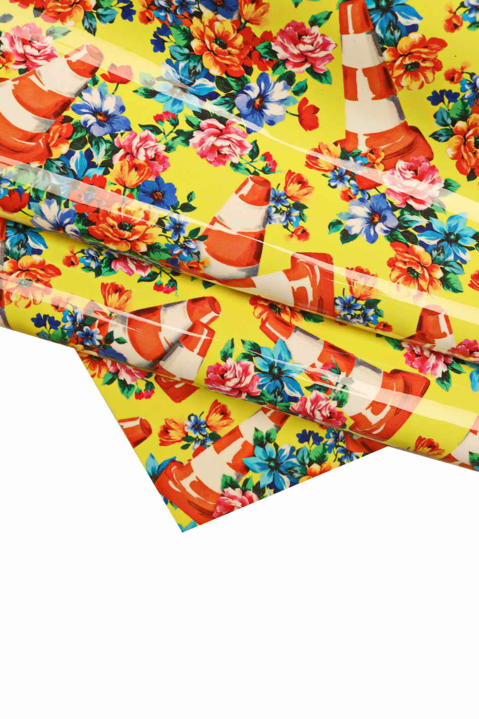 MULTICOLOR special leather hide, yellow patent cowhide with floral print and cones, glossy calfskin, 1.0-1.2mm