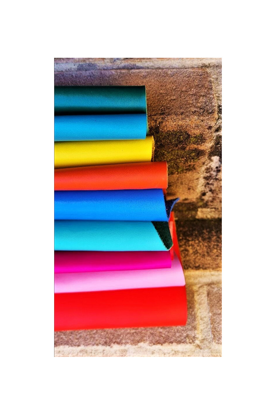 10 leather offcuts of patterned mixed leather with different bright solid colors and softness, sporty / refined look . Cutouts of genuine Italian leather. Minimum size 6 x 4 inches.