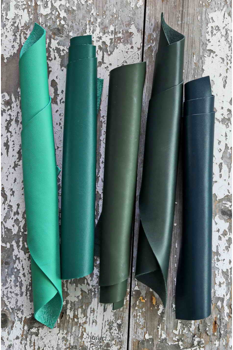 5 smooth calf leather offcuts green color and softness various, sporty / refined look .Cutouts of genuine Italian leather. Minimum size 10 x 8 inches.