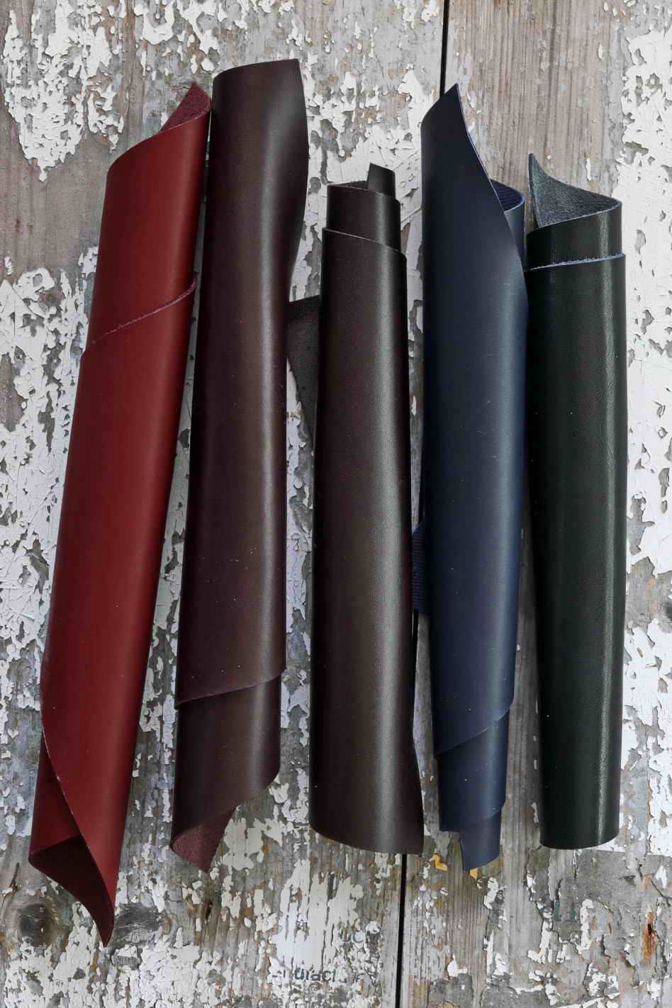 5 smooth calf leather offcuts with different colors and softness, sporty / refined look in different colors. Cutouts of genuine Italian leather. Minimum size 10 x 8 inches.