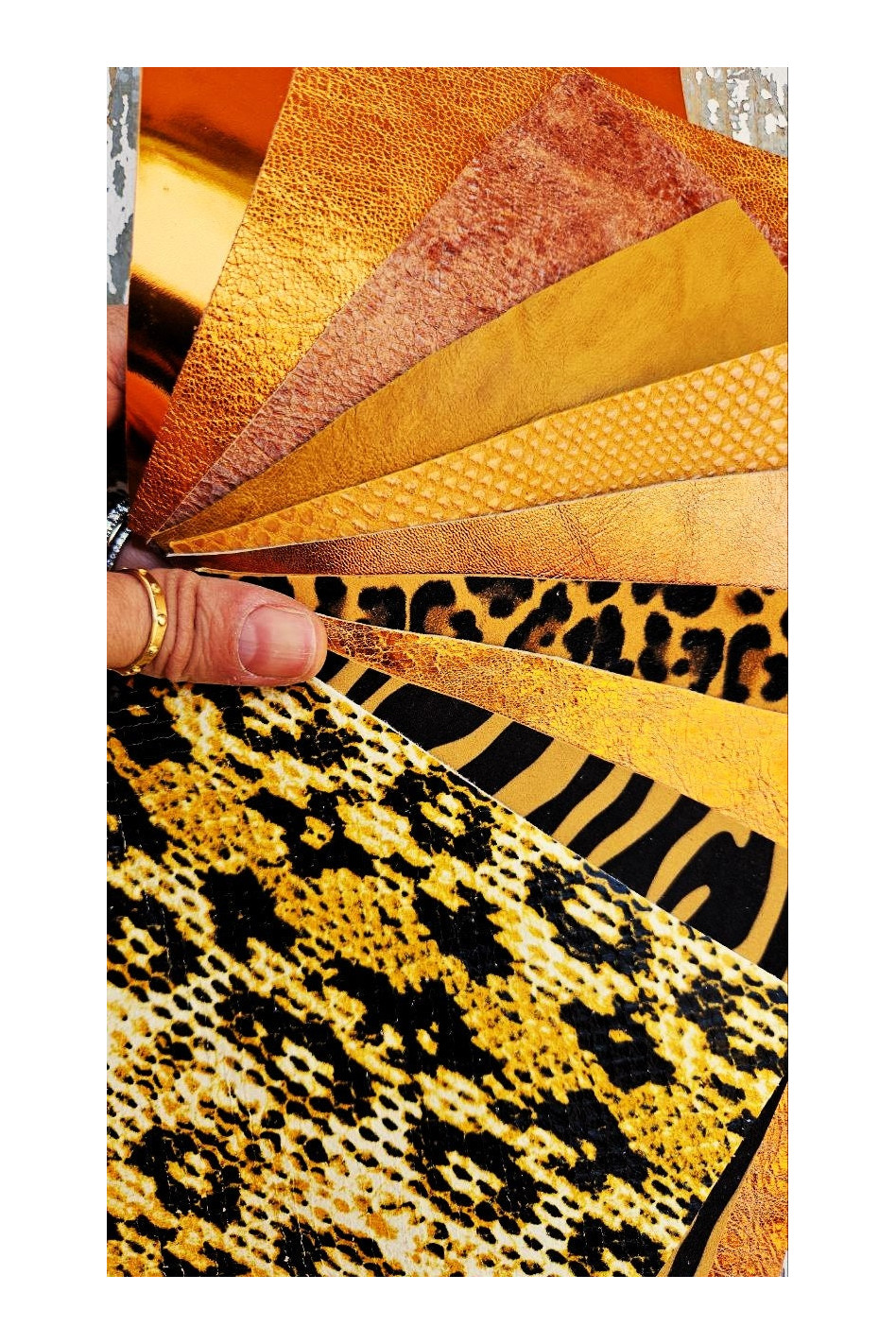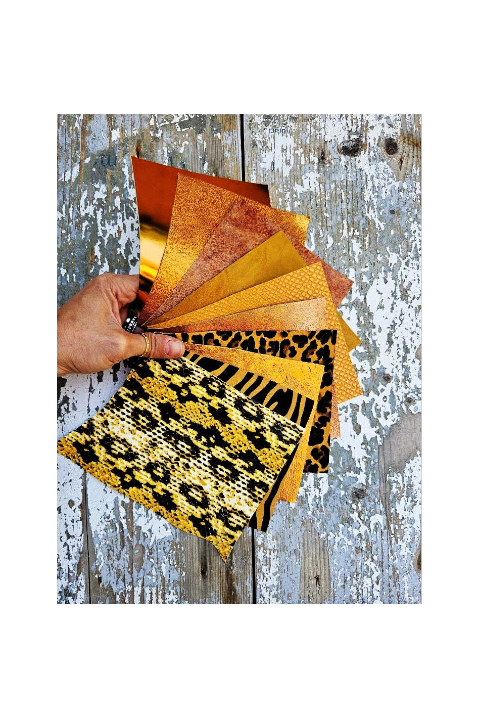 10 Selected leather scraps, YELLOW and ORANGE tones, printed and foils various, mix selection leather remnants as per pictures R