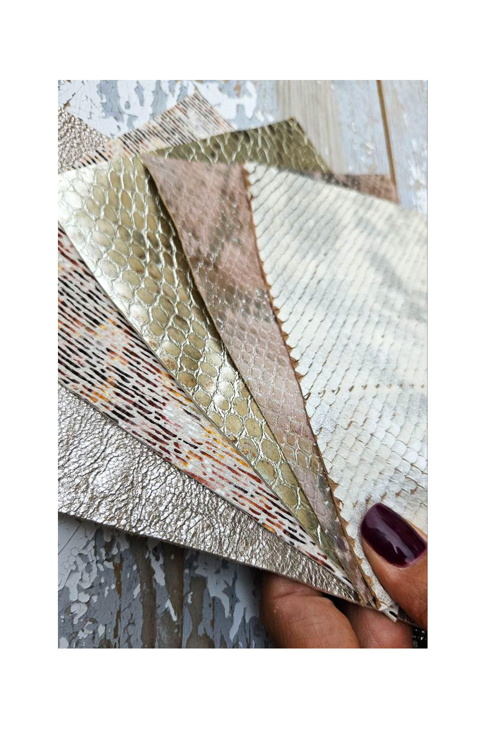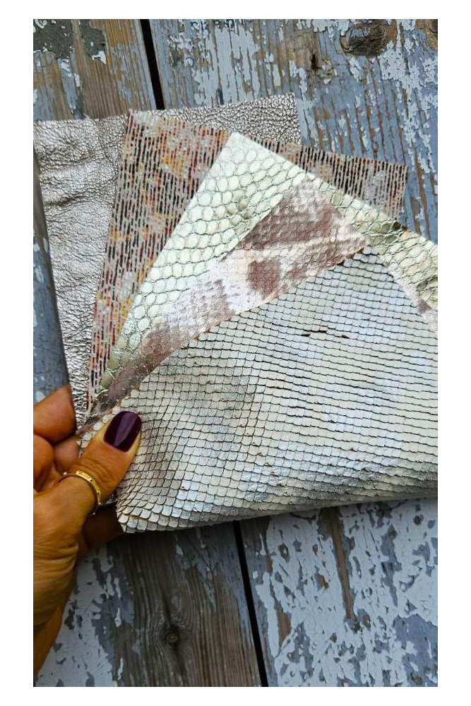 5 Selected leather scraps, PLATINUM and PINK tones, printed and metalic printed, mix selection leather remnants as per pictures