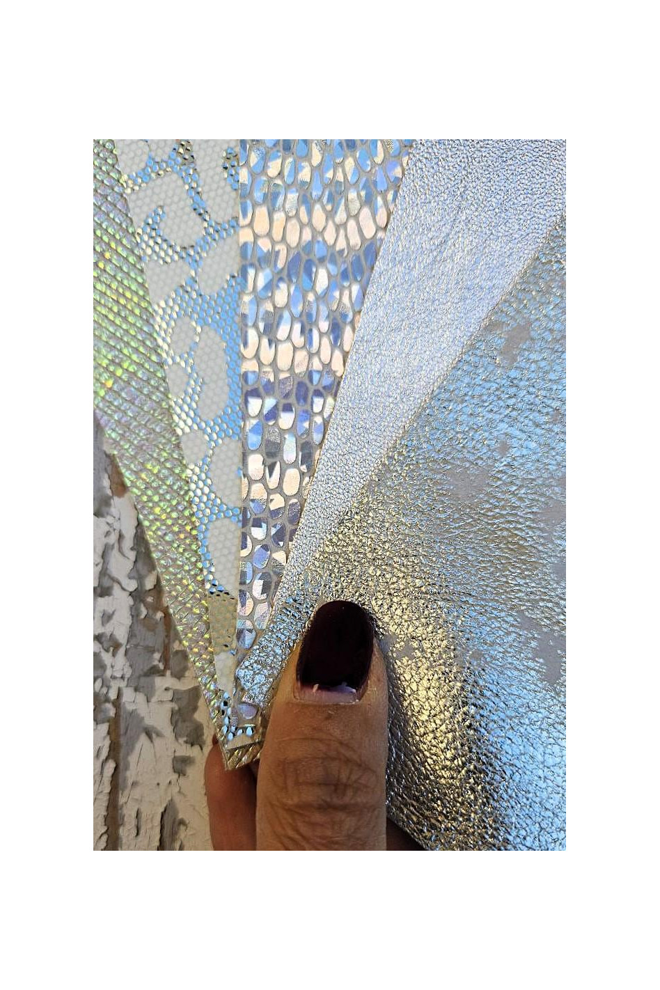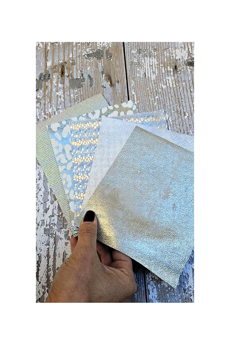 5 Selected leather scraps,silver, platinum, iridescent tones, printed and metalic printed, mix leather pieces as per pictures