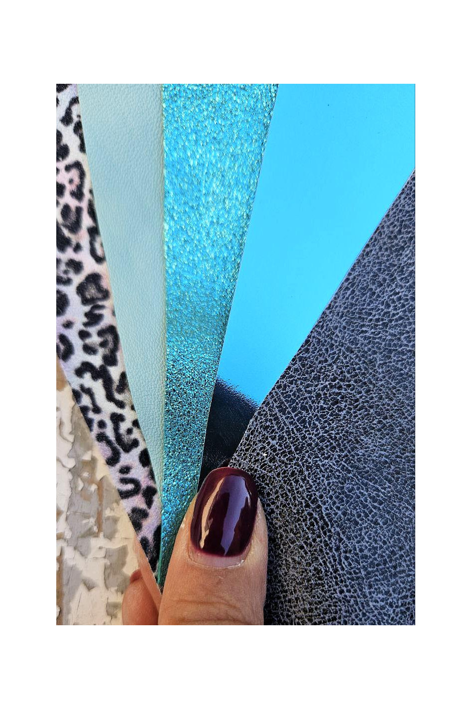 5 Selected leather scraps, TURCHOISE, SKY BLUE tones, printed and metalic printed,mix selection leather pieces as per pictures