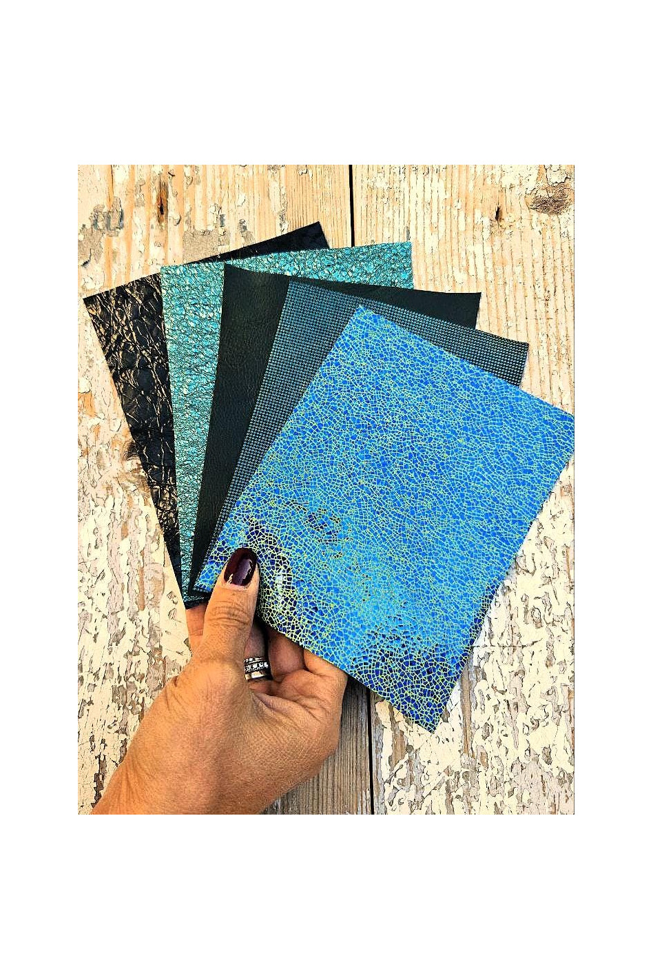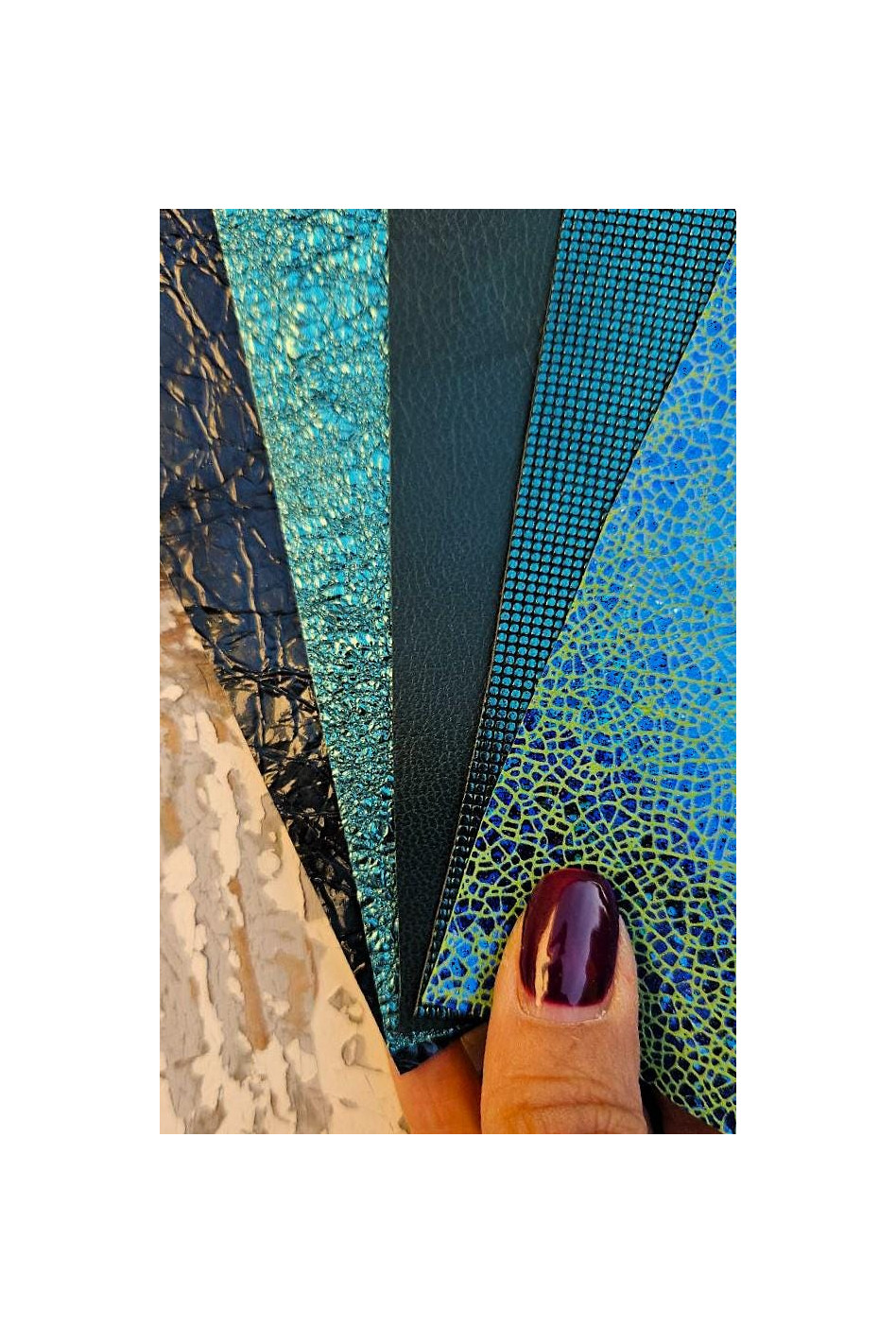 5 Selected leather scraps, GREEN tones, printed and metalic printed,mix selection leather pieces as per pictures