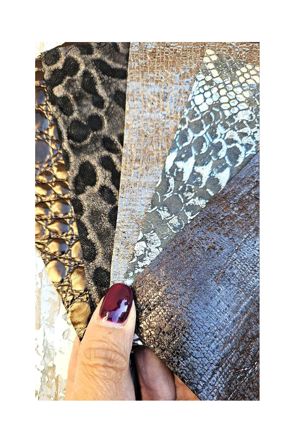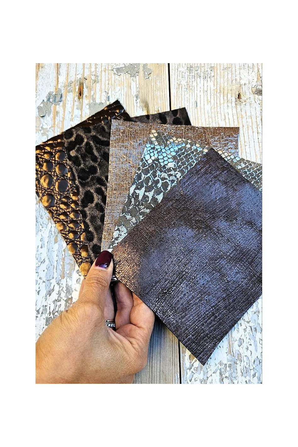 5 Selected leather scraps, BROWN and BRONZE tones, printed and metalic printed,mix selection leather pieces as per pictures