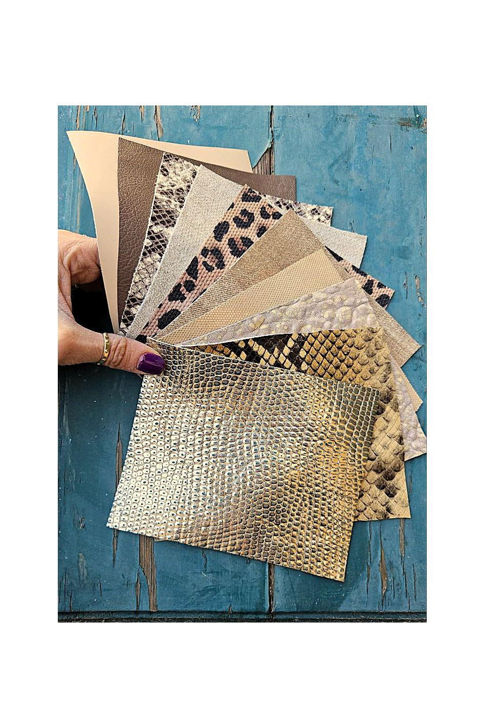 10 Selected leather scraps, BROWN and BEIGE tones, printed and metalic printed,mix selection leather pieces as per pictures