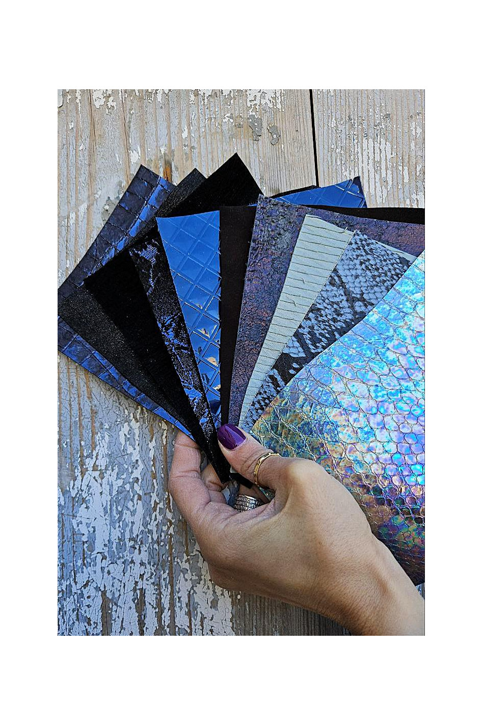 10 Selected leather scraps, BLUE tones, printed and metalic printed,mix selection leather pieces as per pictures