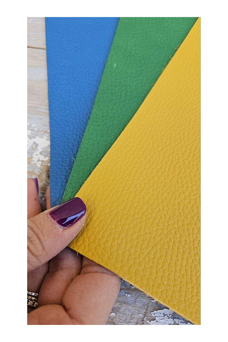 Gorgeous fancy pebble grain leather scraps in yellow, green and blue!
