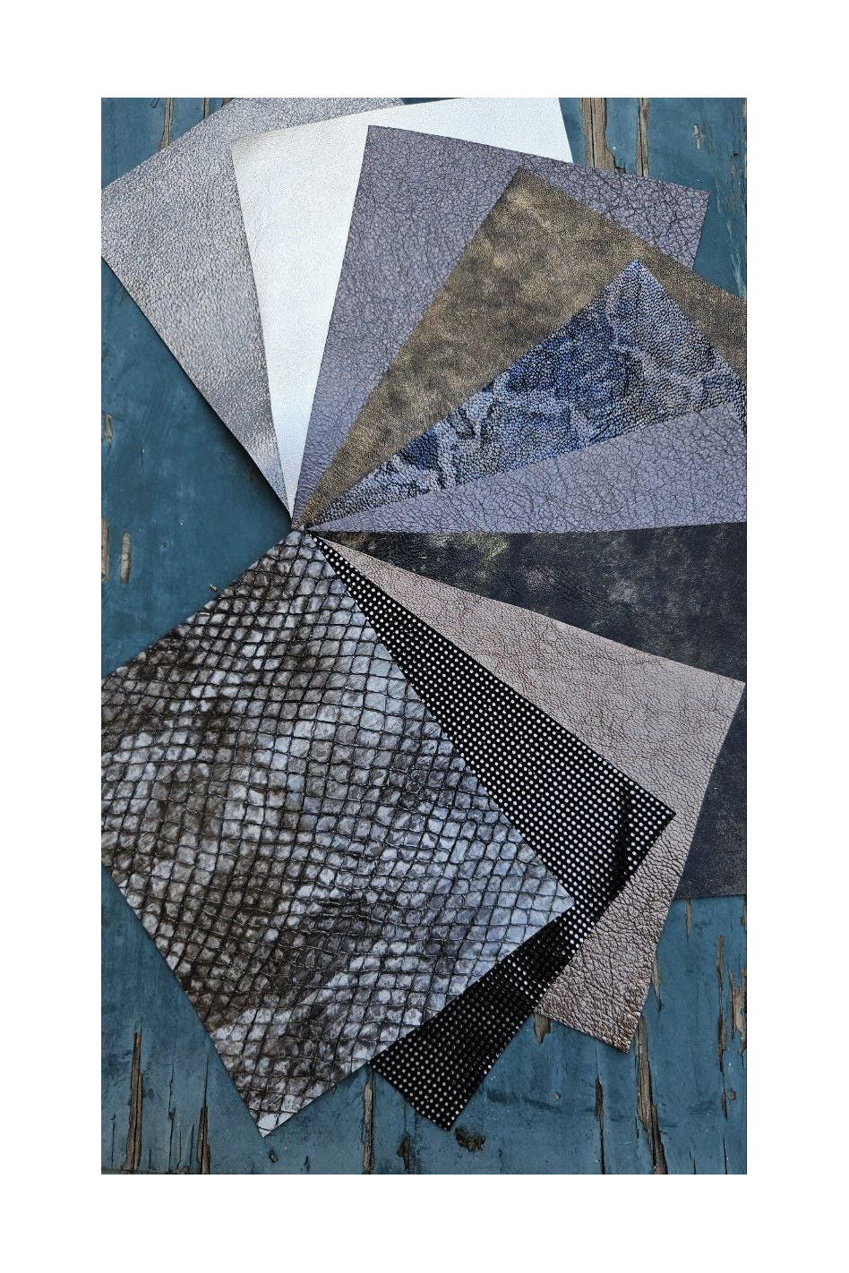 10 Selected leather scraps, GREY and BRONZE colors, printed and foils various, mix selection leather remnants as per pictures