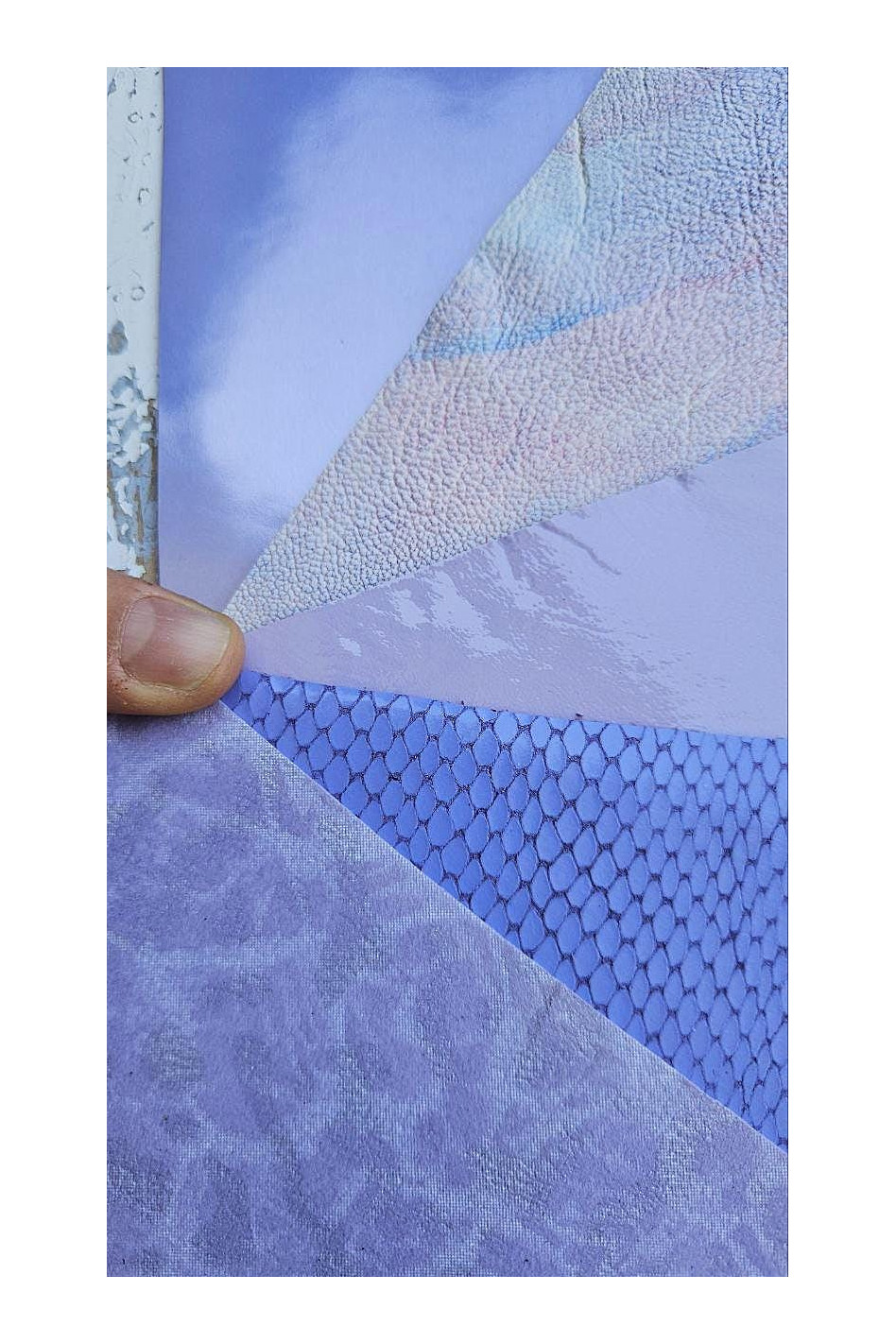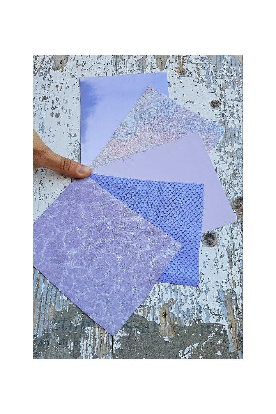 5 Selected leather scraps, VIOLET LILAC tones, printed and metalic printed, mix selection leather remnants as per pictures