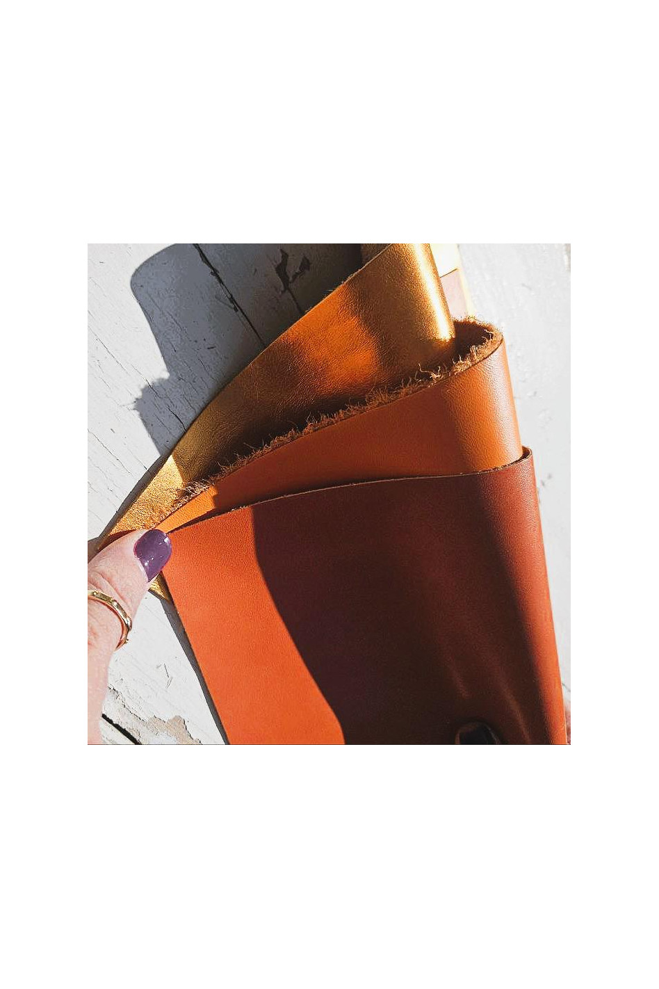 Some minor surface defects (holes, light stains, scars, blemishes) and thinner/softer edges of leather are expected as for most full hide leather. If need more details info on this, feel free to contact us. The visible defects were shown in pictures.